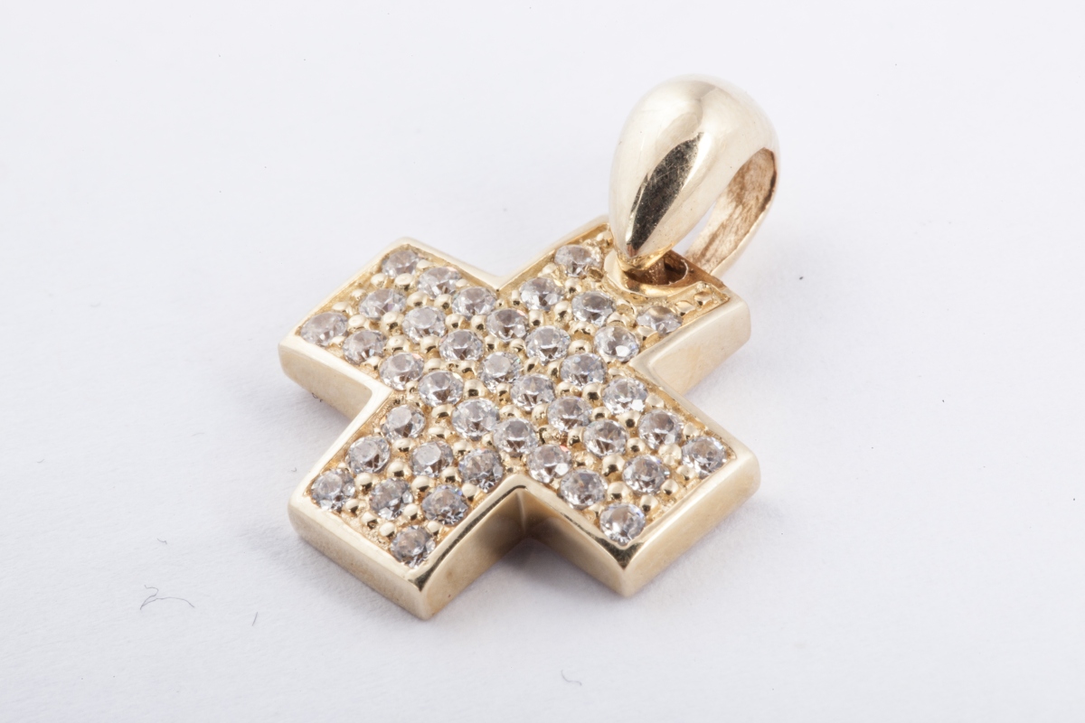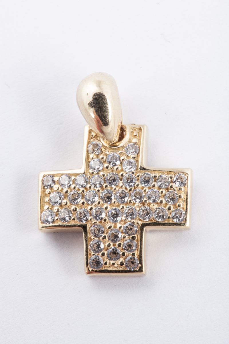 PENDENTIF croix en or jaune, serti de pierres de synthèse blanches.