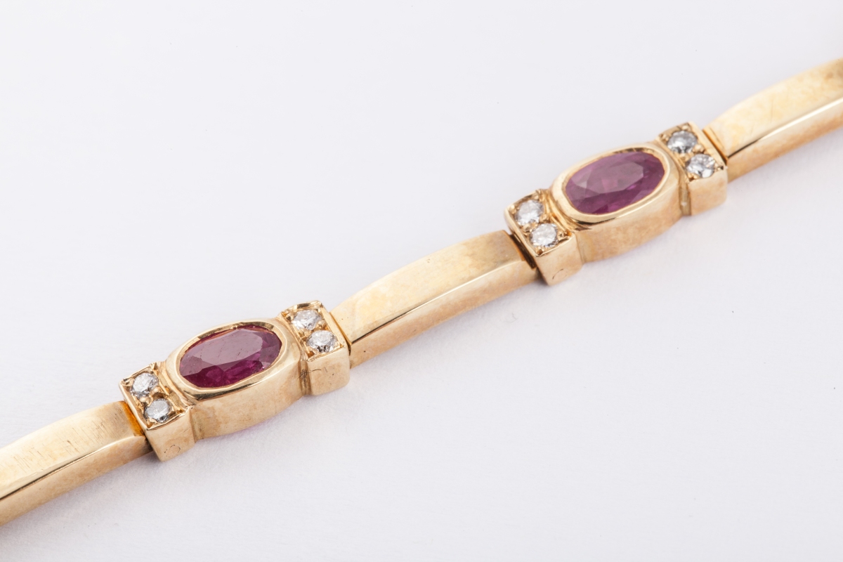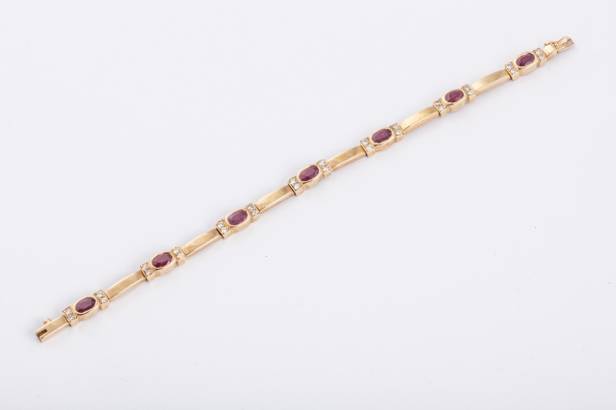 BRACELET articulé en or jaune serti de rubis ovales entre quatre petits diamants.