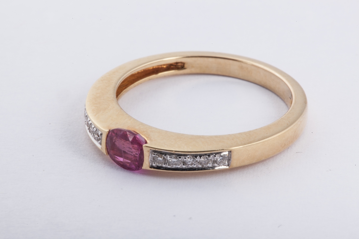 BAGUE en or jaune sertie d'un rubis ovale entre deux lignes de brillants.