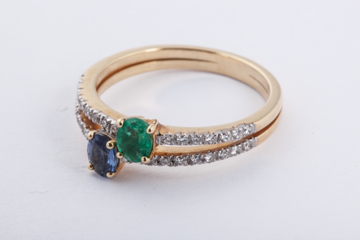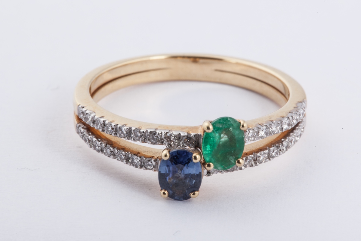 BAGUE DEUX CORPS en or jaune ornée d'une émeraude et d'un saphir entre deux lignes de diamants.