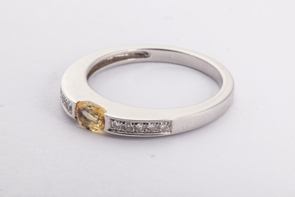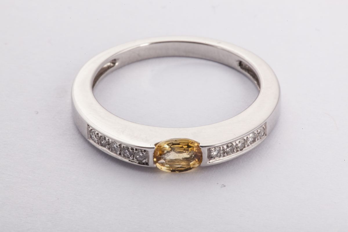 BAGUE en or gris, ornée d'un saphir jaune de forme ovale entre deux lignes de diamants.