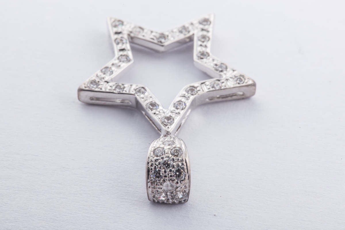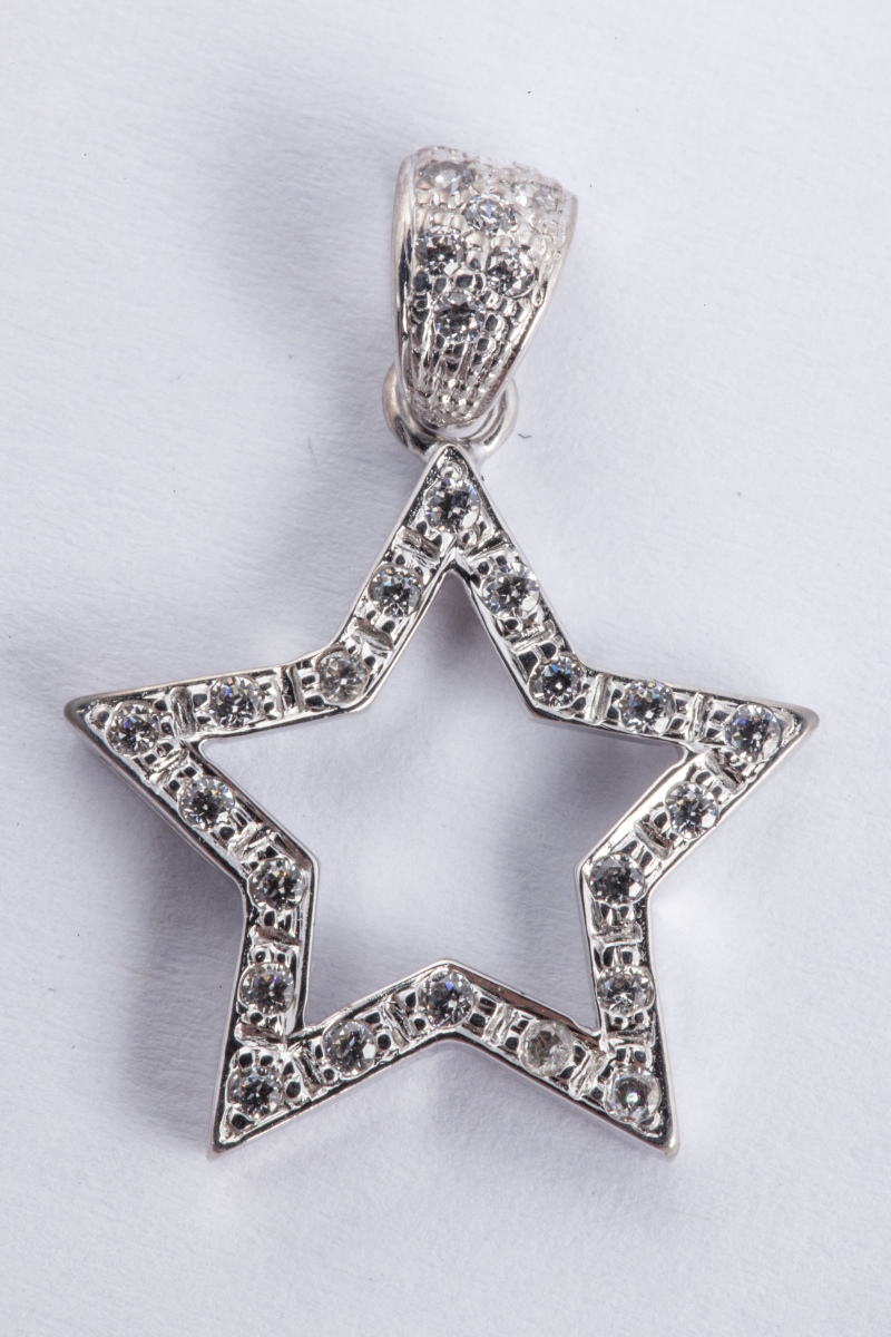 PENDENTIF étoile en or gris, serti de pierres de synthèse blanches.
