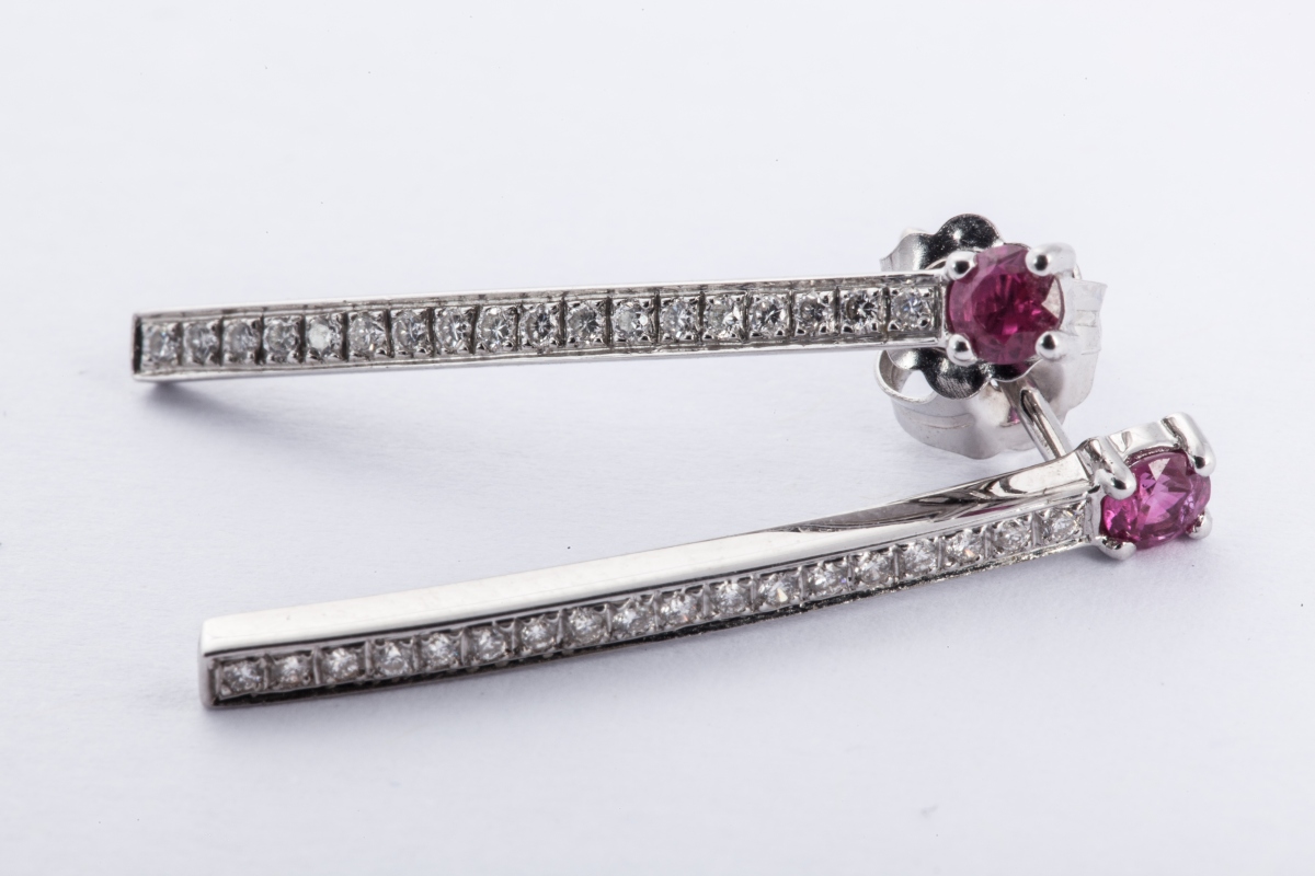 Paire de PENDANTS d' OREILLE en or gris, sertie d'une ligne de petits diamants et d'un rubis de forme ronde.