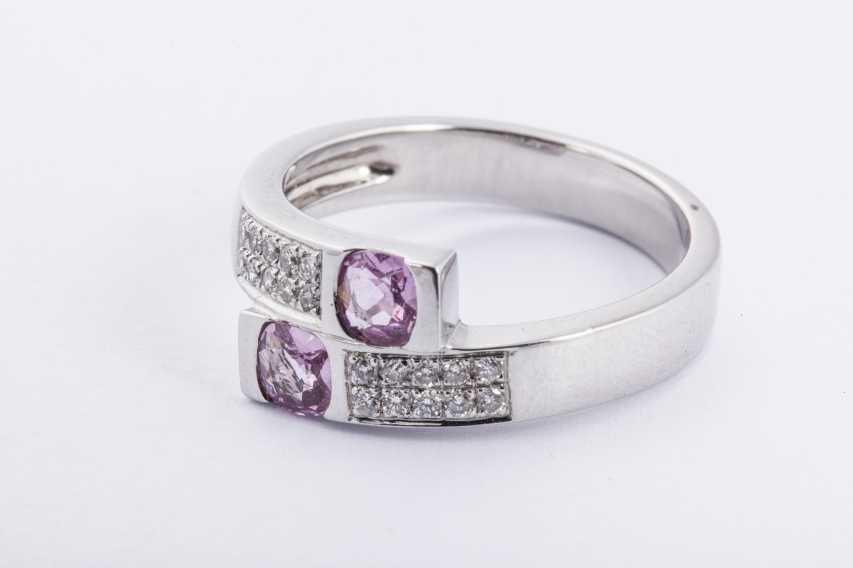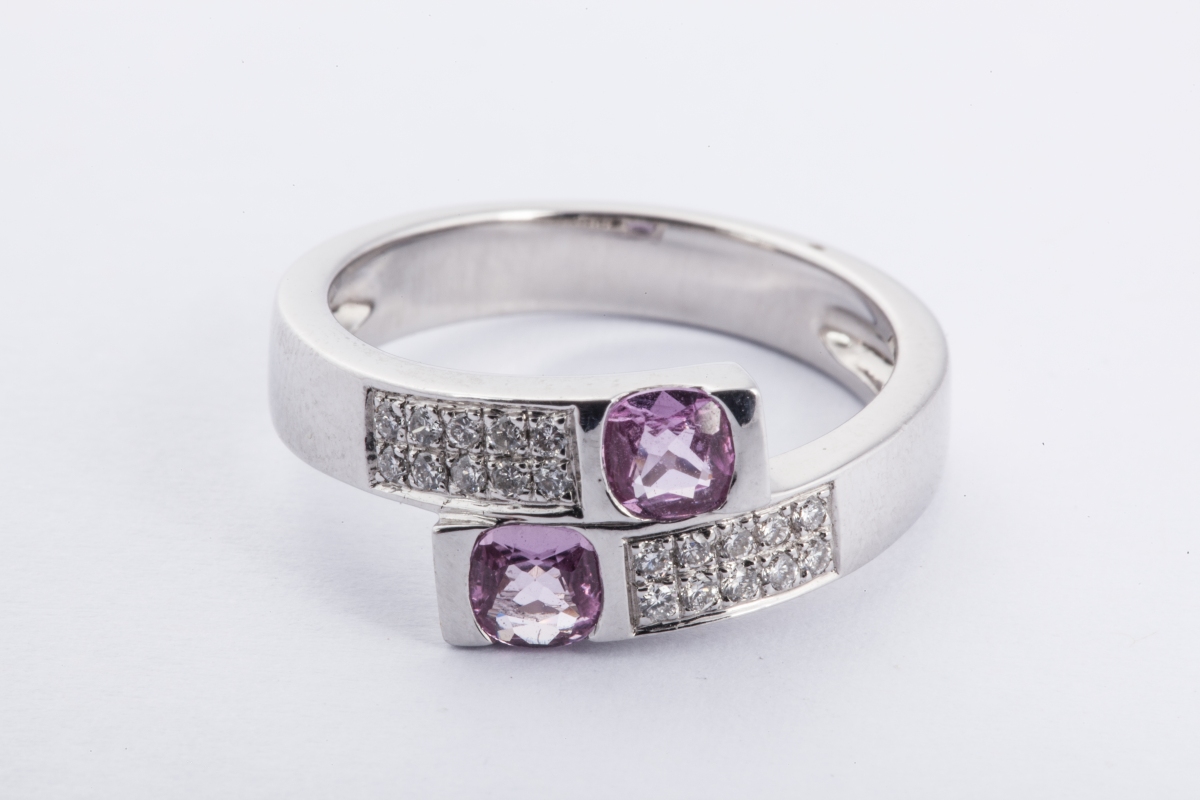 BAGUE "TOI et MOI" en or gris, sertie de deux saphirs roses entre deux pavages de diamants.