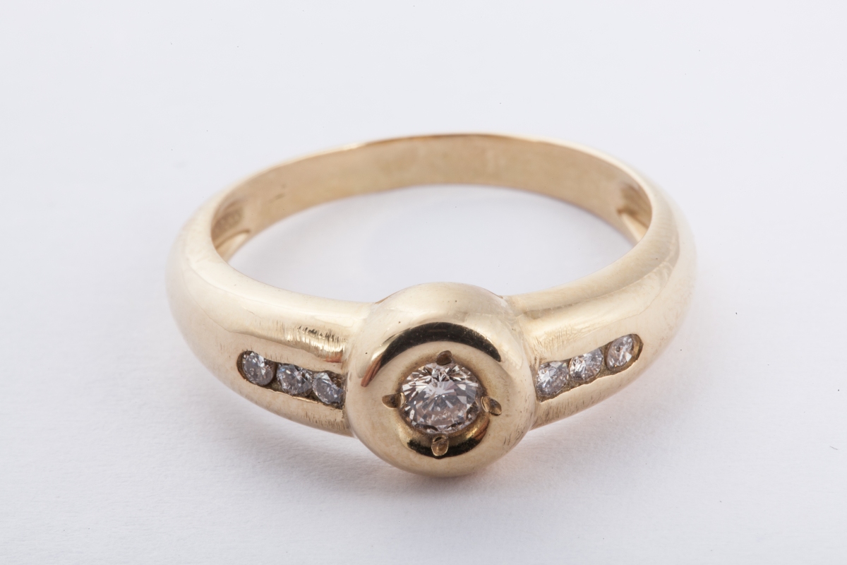 BAGUE JONC en or jaune orné d'un diamant principal au centre entre six petits diamants.