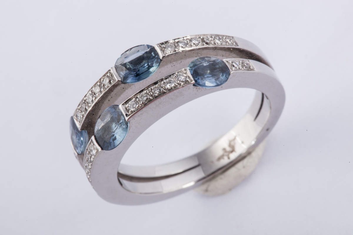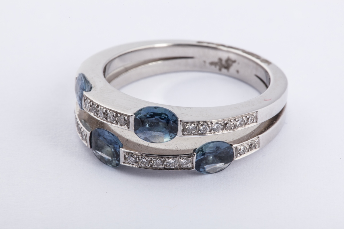 BAGUE deux corps en or gris, sertie de quatre saphirs ovales entre des lignes de petits diamants.