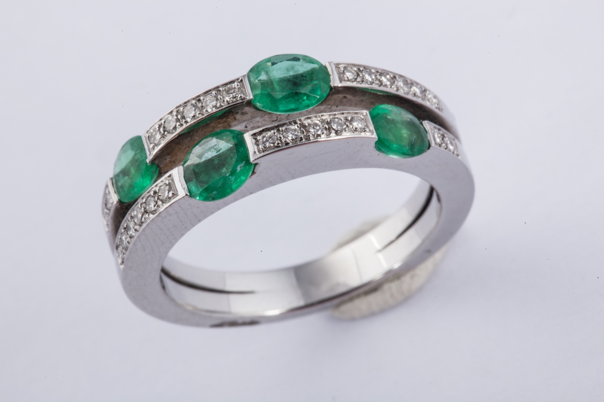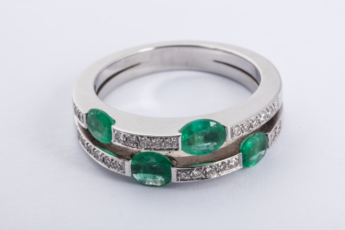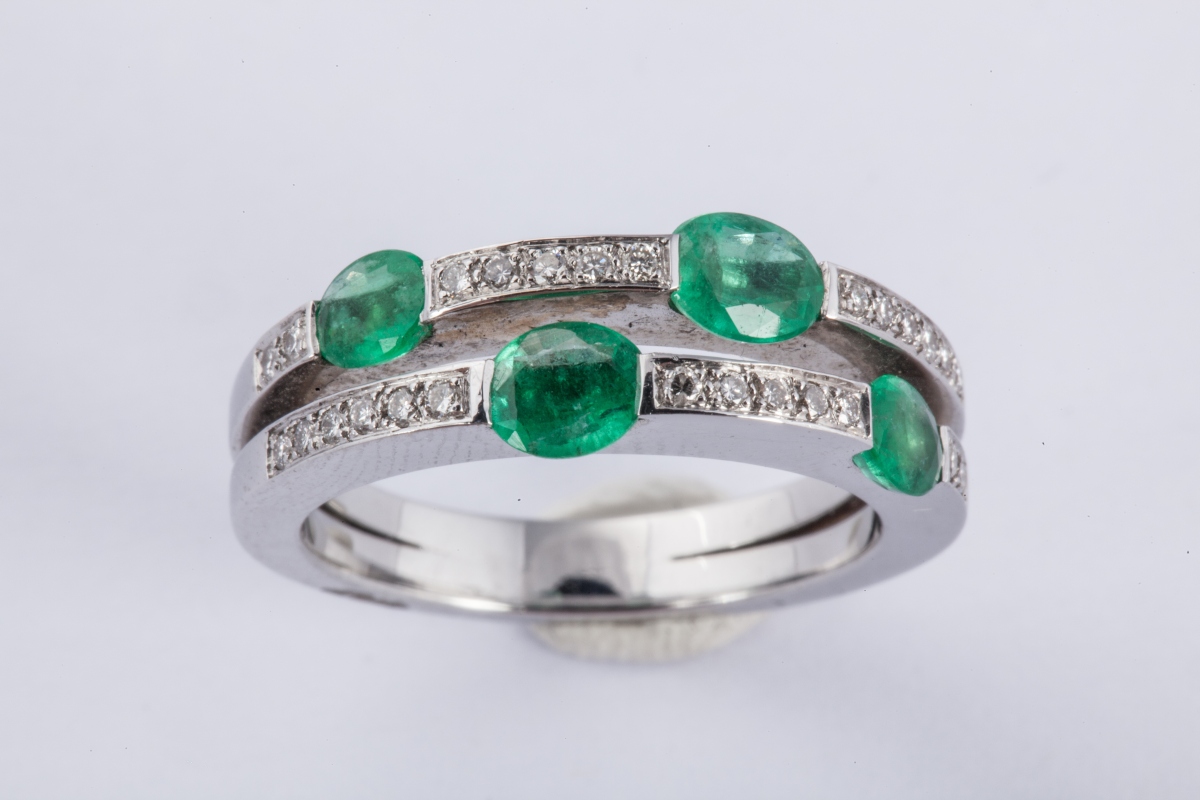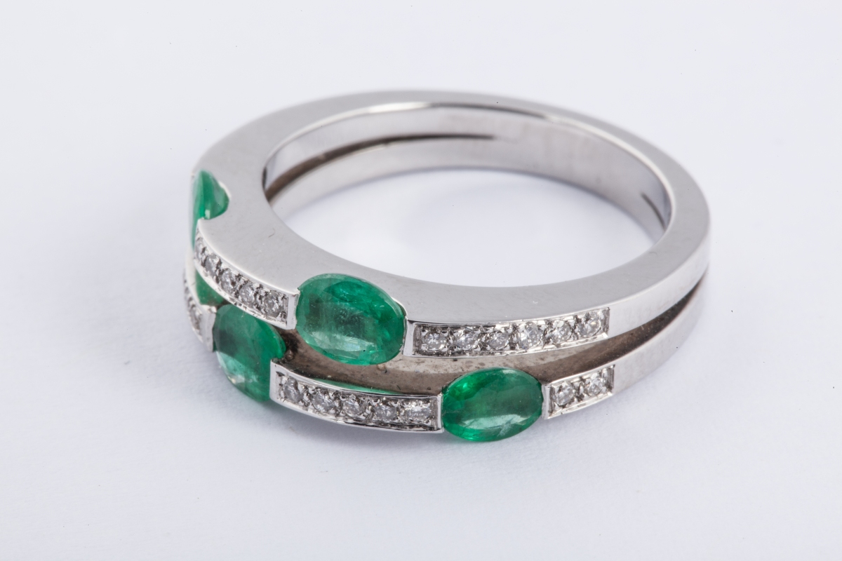 BAGUE deux corps en or gris, sertie de quatre émeraudes entre des lignes de petits diamants.
