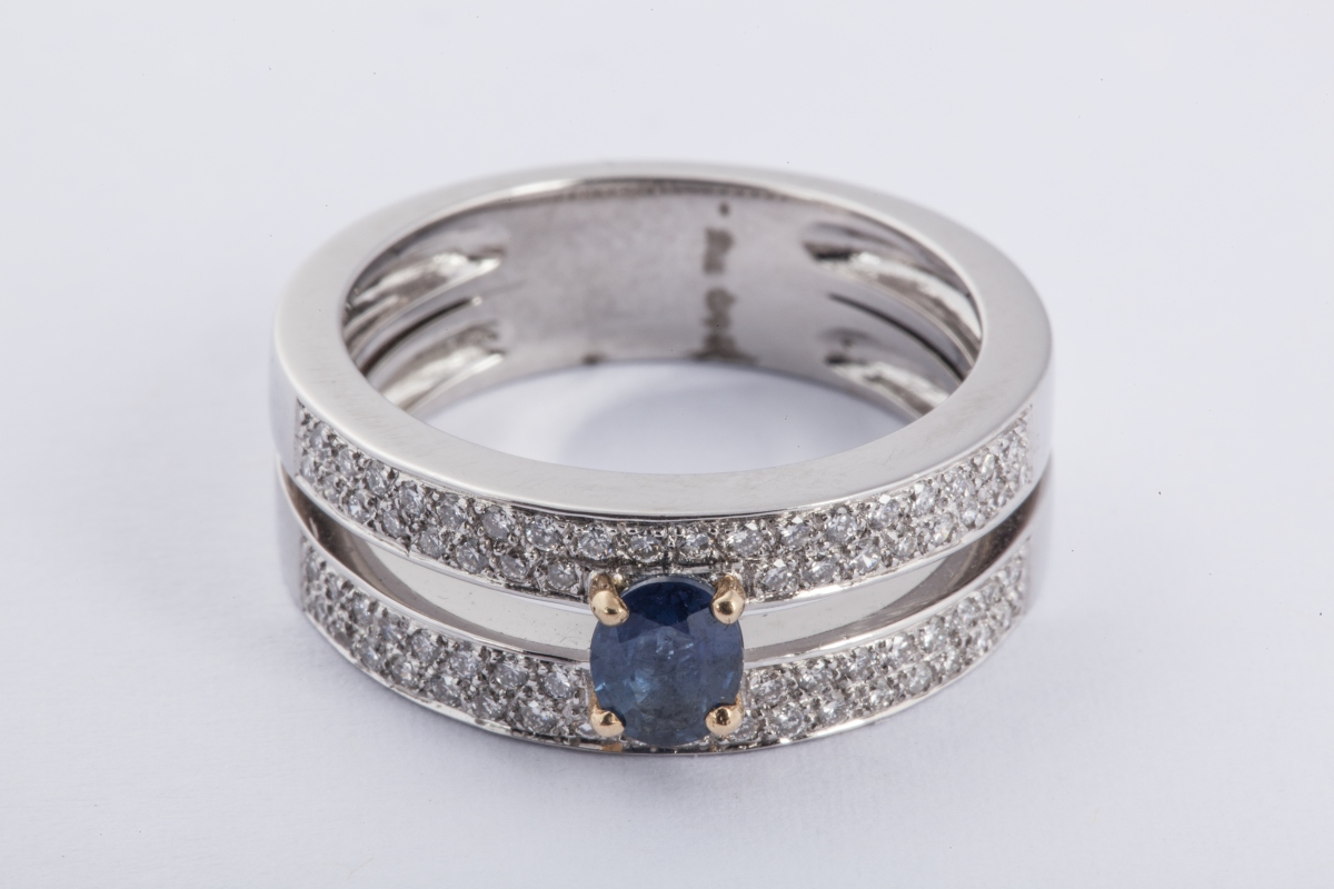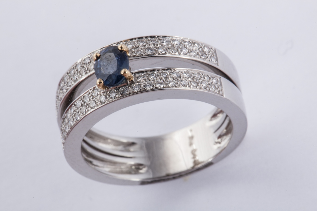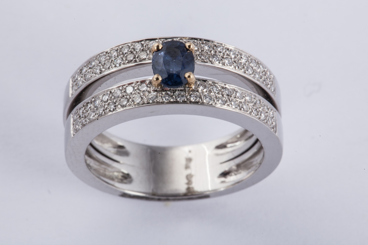 BAGUE deux corps ornée d'un saphir ovale entre quatre lignes de petits brillants.