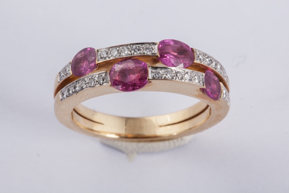 BAGUE deux corps sertie de quatre rubis ovales entre des lignes de petits brillants.
