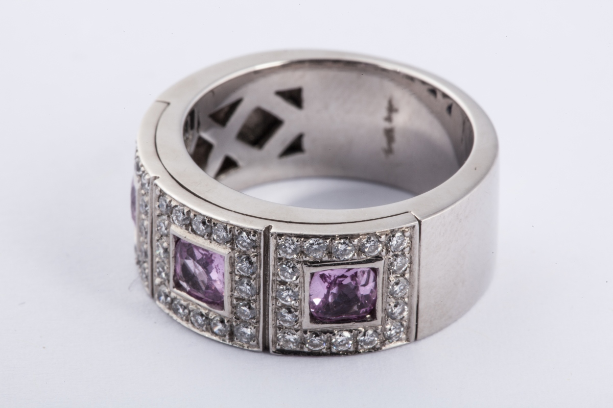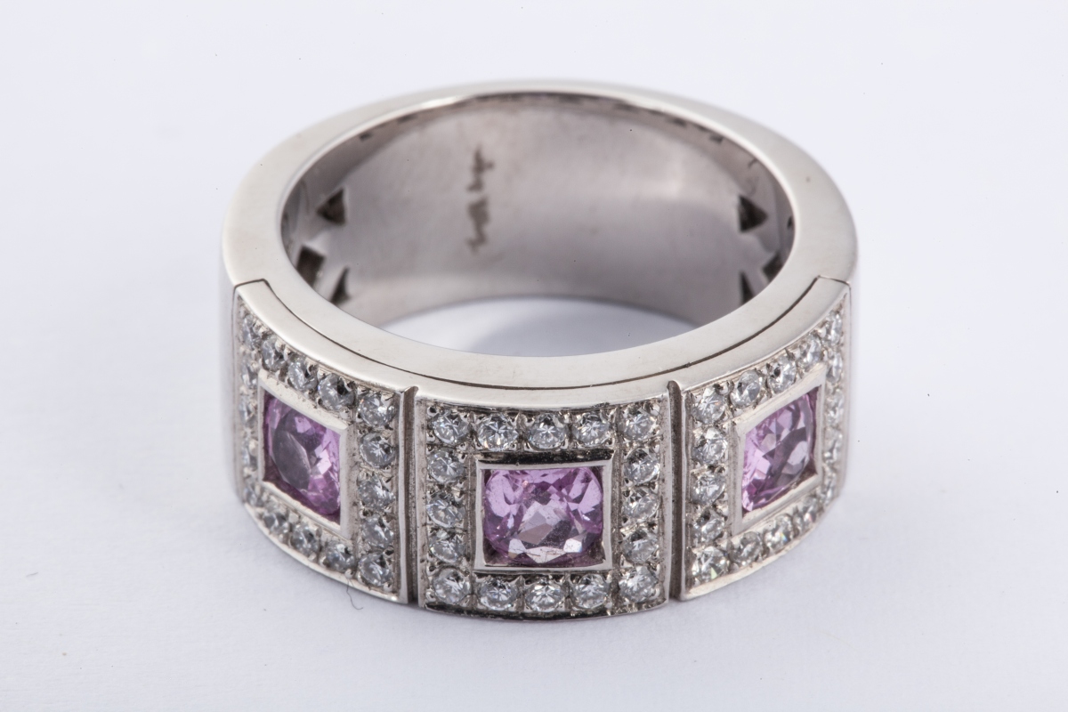 BAGUE en or gris, ornée de trois motifs carrés sertis au centre d'un saphir rose dans un entourage de petits brillants.