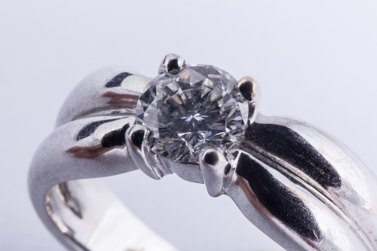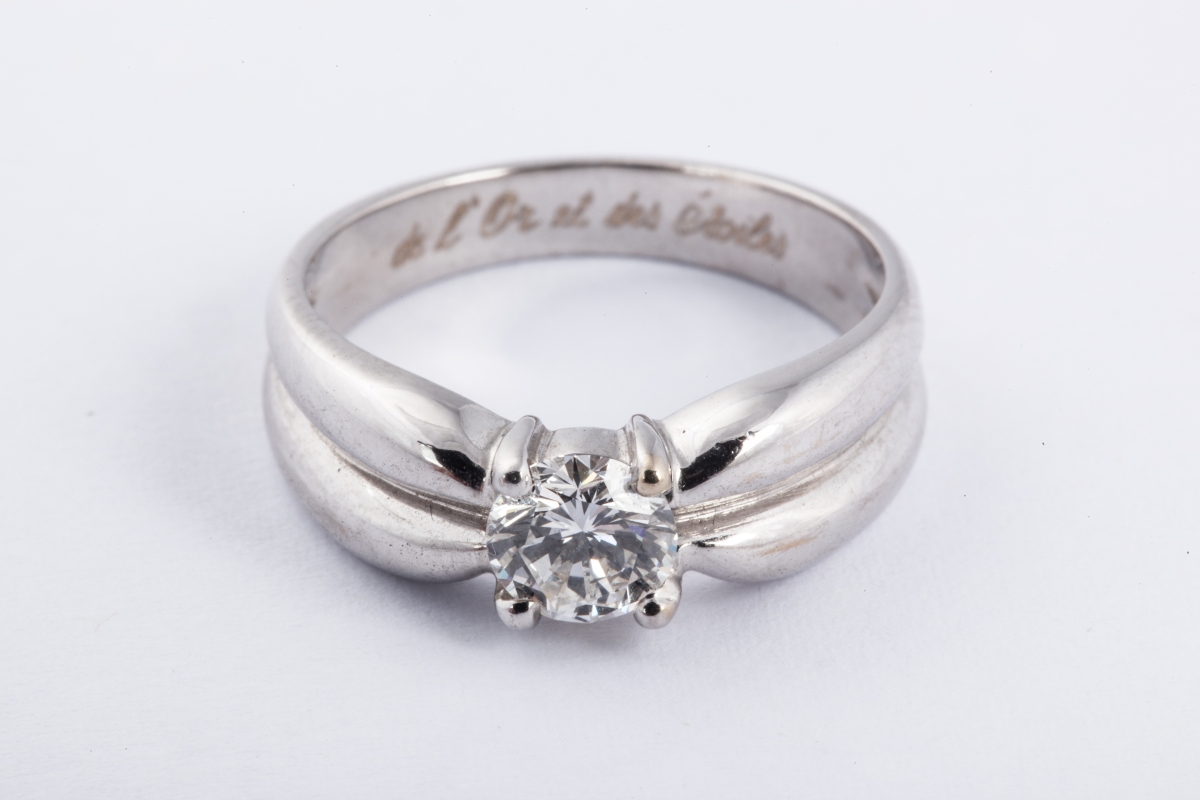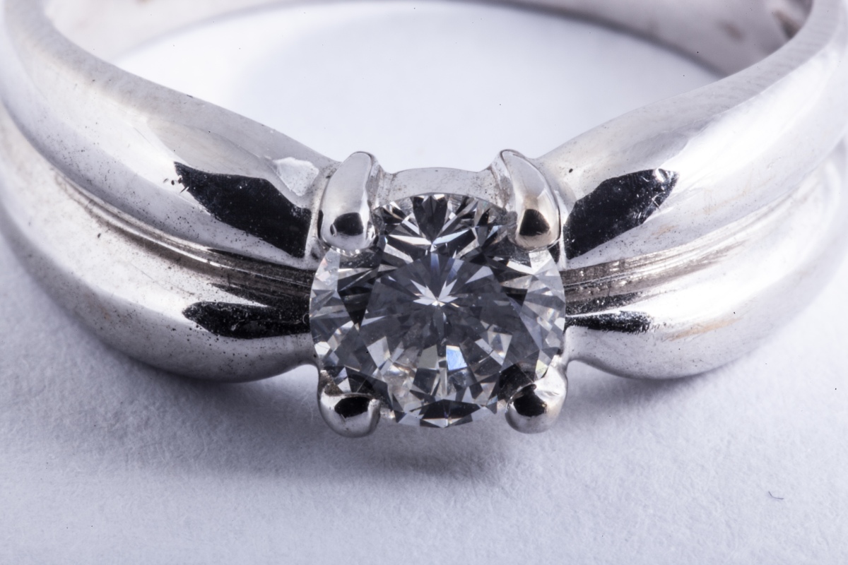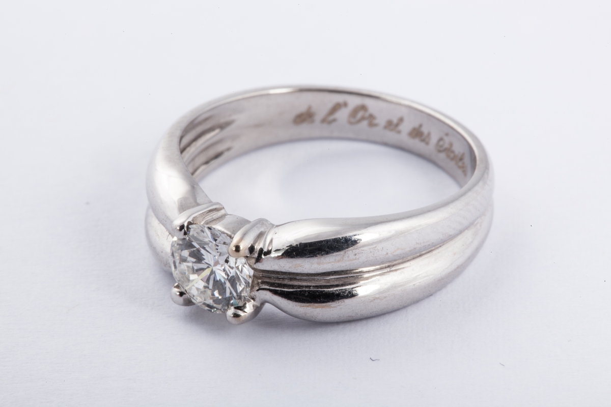 BAGUE en or gris, sertie d'un diamant rond de taille brillant.
