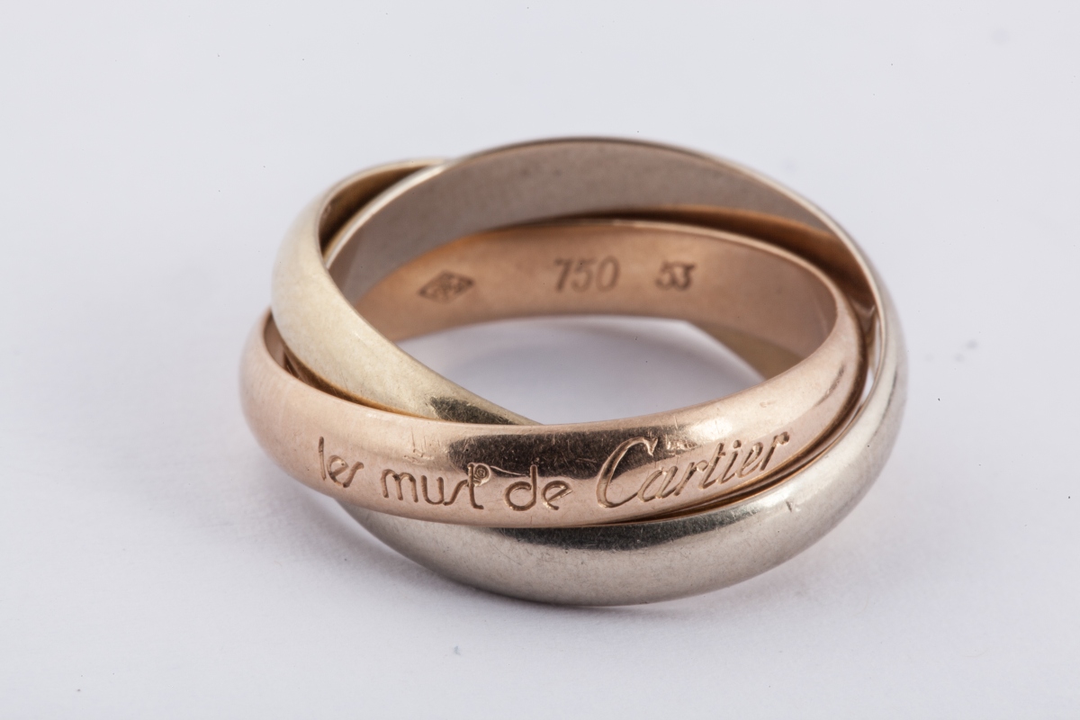 CARTIER. BAGUE TROIS ORS, signée "le must de Cartier". Poids 8,3 g.