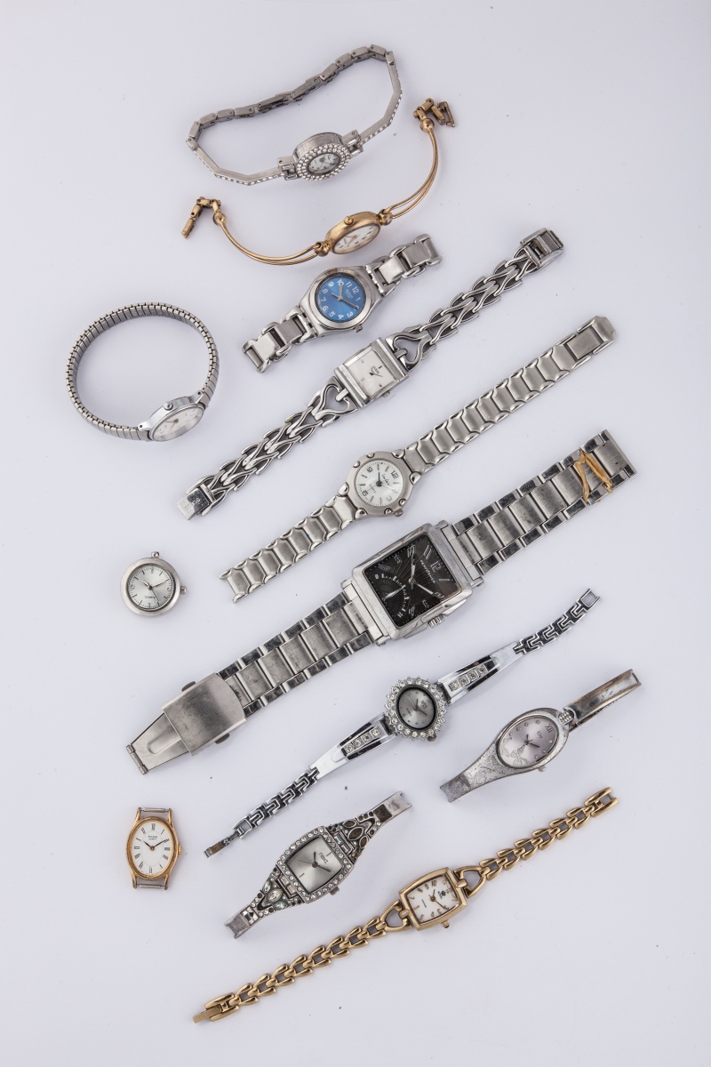 Lot de ONZE MONTRES bracelets de dame et deux montres (manque les tours de poignet) de dame, en acier