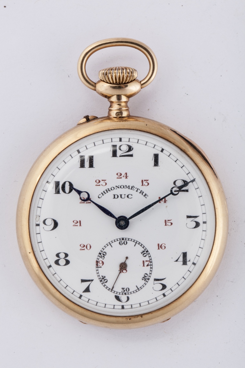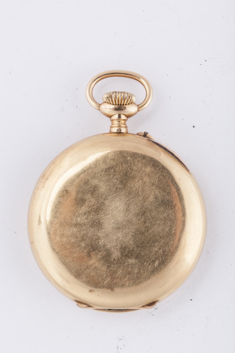 MONTRE DE POCHE à remontoir au pendant en or jaune uni, cadran émaillé blanc à chiffres arabes, trotteuse à six heures, balancier bimétallique à compensation, échappement à ancre empierré. Poids brut: 81 g.
