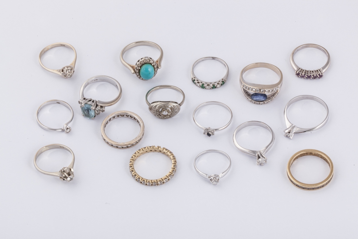 SEIZE BAGUES ou alliances en or, certaines en métal, ornées de pierres fines et synthétiques.