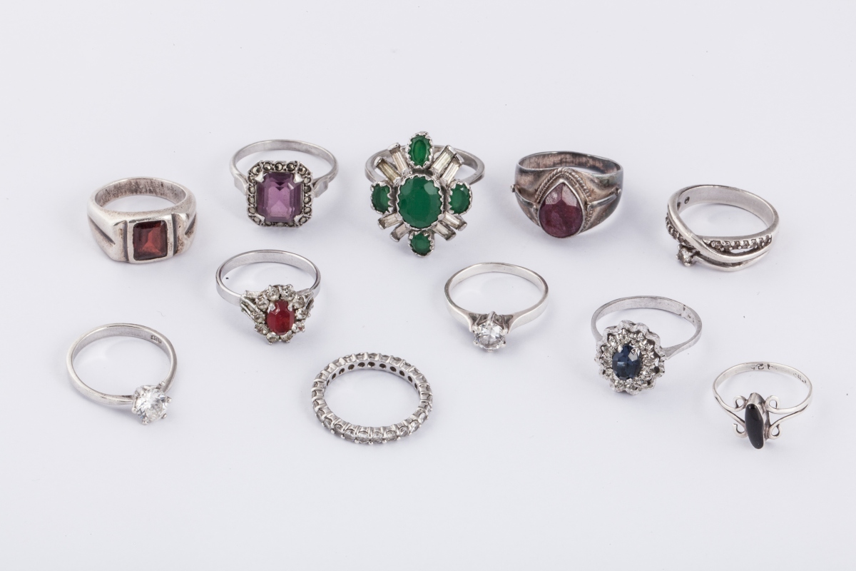 Lot de ONZE BAGUES ou alliances en métal et or, serties de pierres de synthèses et de quelques pierres fines.