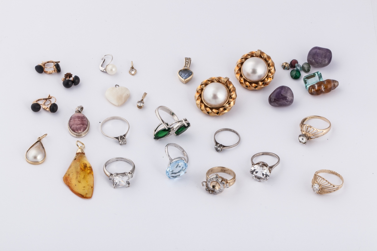 Lot de BIJOUX DIVERS en métal, certaines parties en or, sertis de pierres de synthèse, comprenant: bagues, boucles d'oreille et pierres sur papier.