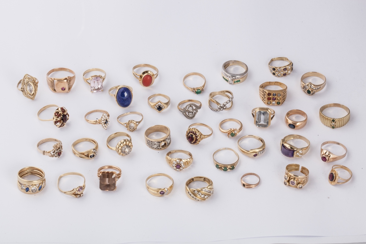 Lot de TRENTE-HUIT BAGUES ou montures de bagues en or, certaines serties de pierres de synthèse ou fines.