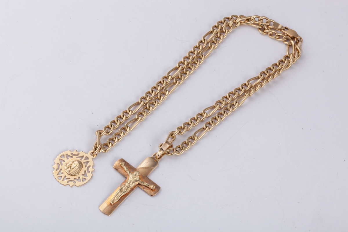 COLLIER articulé en or jaune, supportant en pendentif une médaille religieuse et une croix.