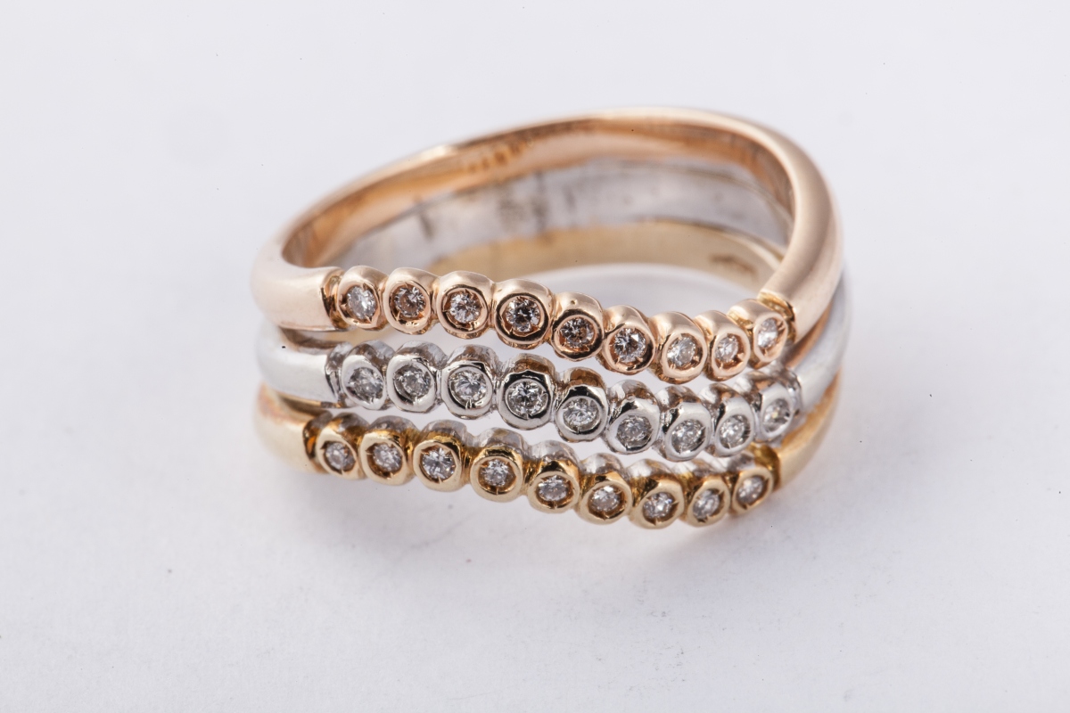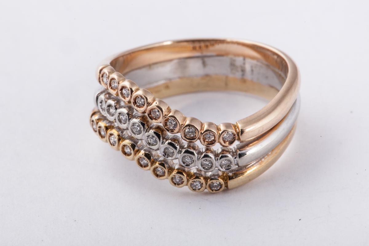 BAGUE mouvementée en or de trois tons, sertie de trois lignes de petits diamants.