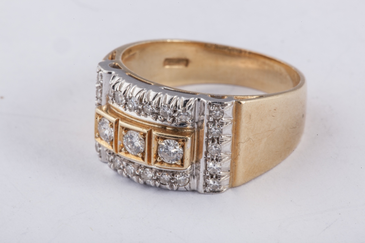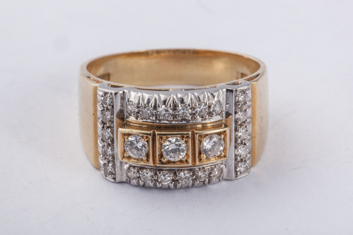 BAGUE en or jaune, ornée d'une ligne de trois diamants de taille brillant dans un entourage de diamants taillés en huit-huit.