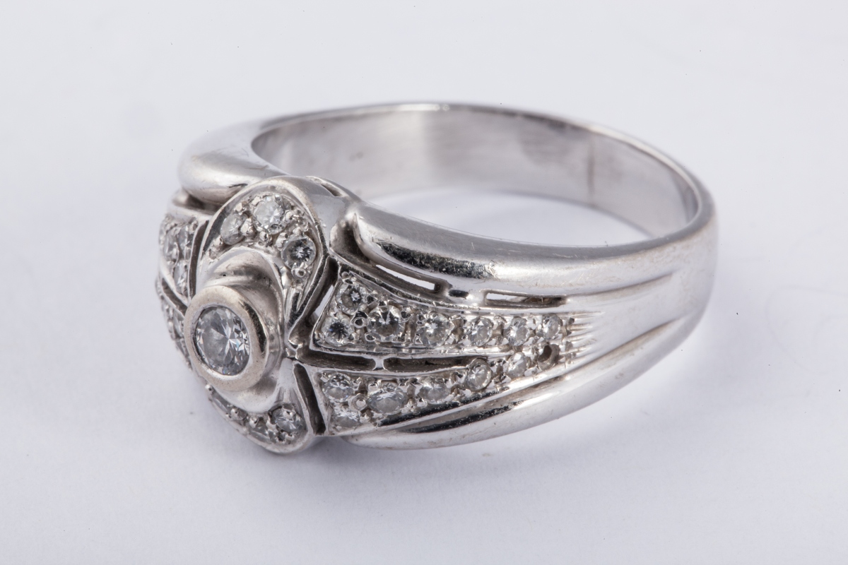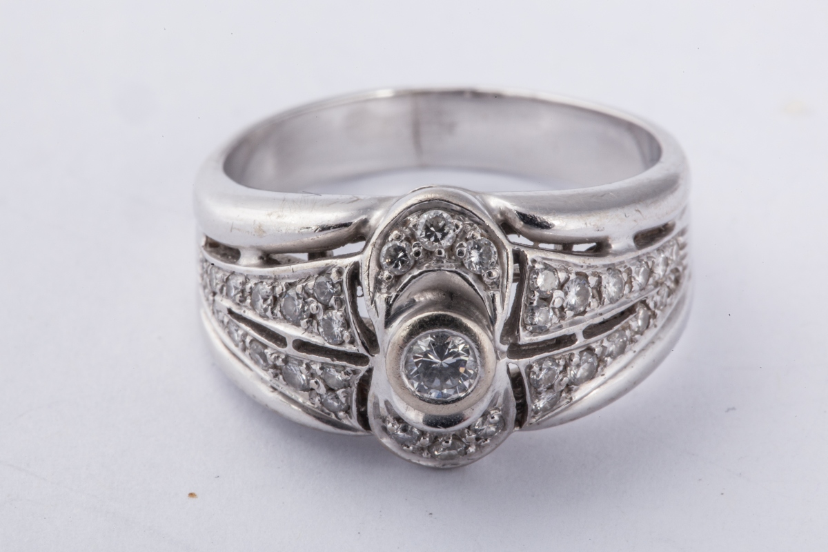 BAGUE en or gris, orné d'un motif géométrique pavé de petits diamants, celui du centre plus important.