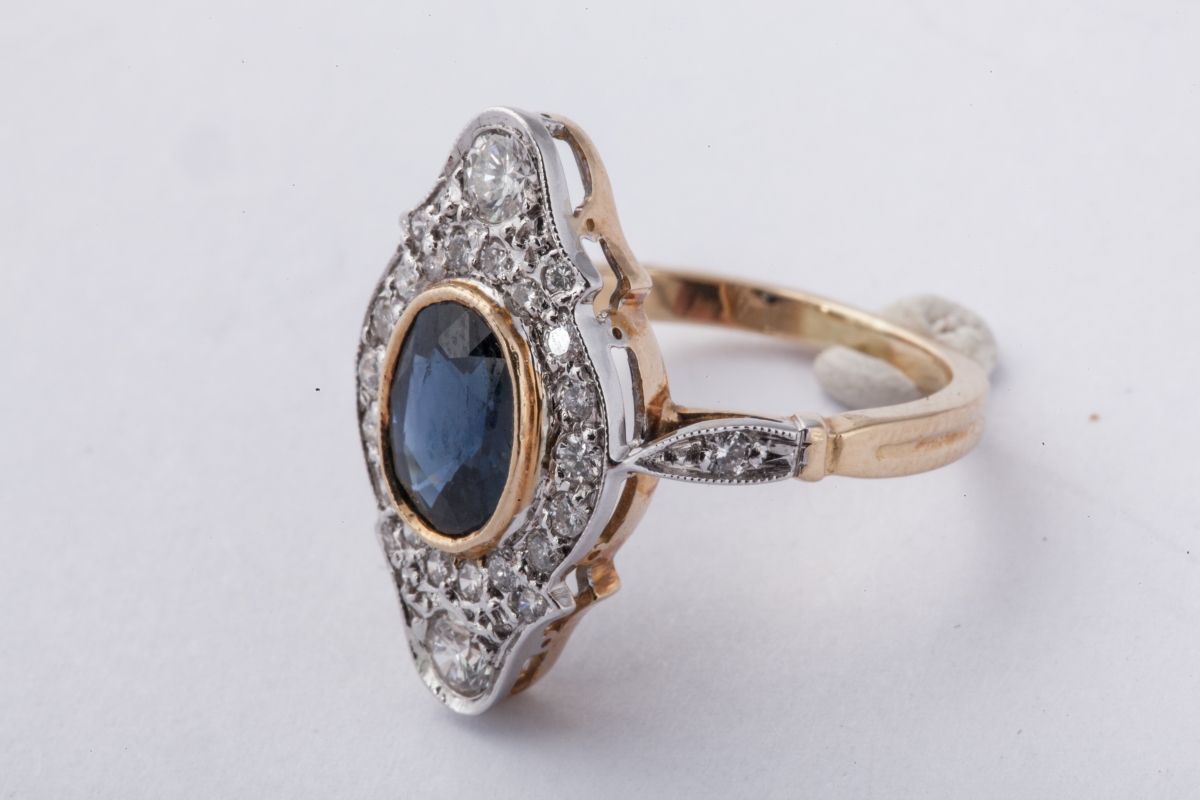 BAGUE en or de deux tons, sertie d'un saphir ovale facetté dans un entourage de petits brillants.