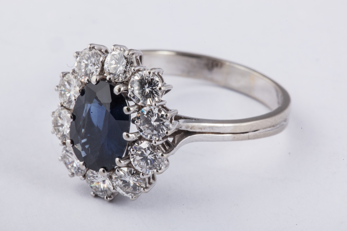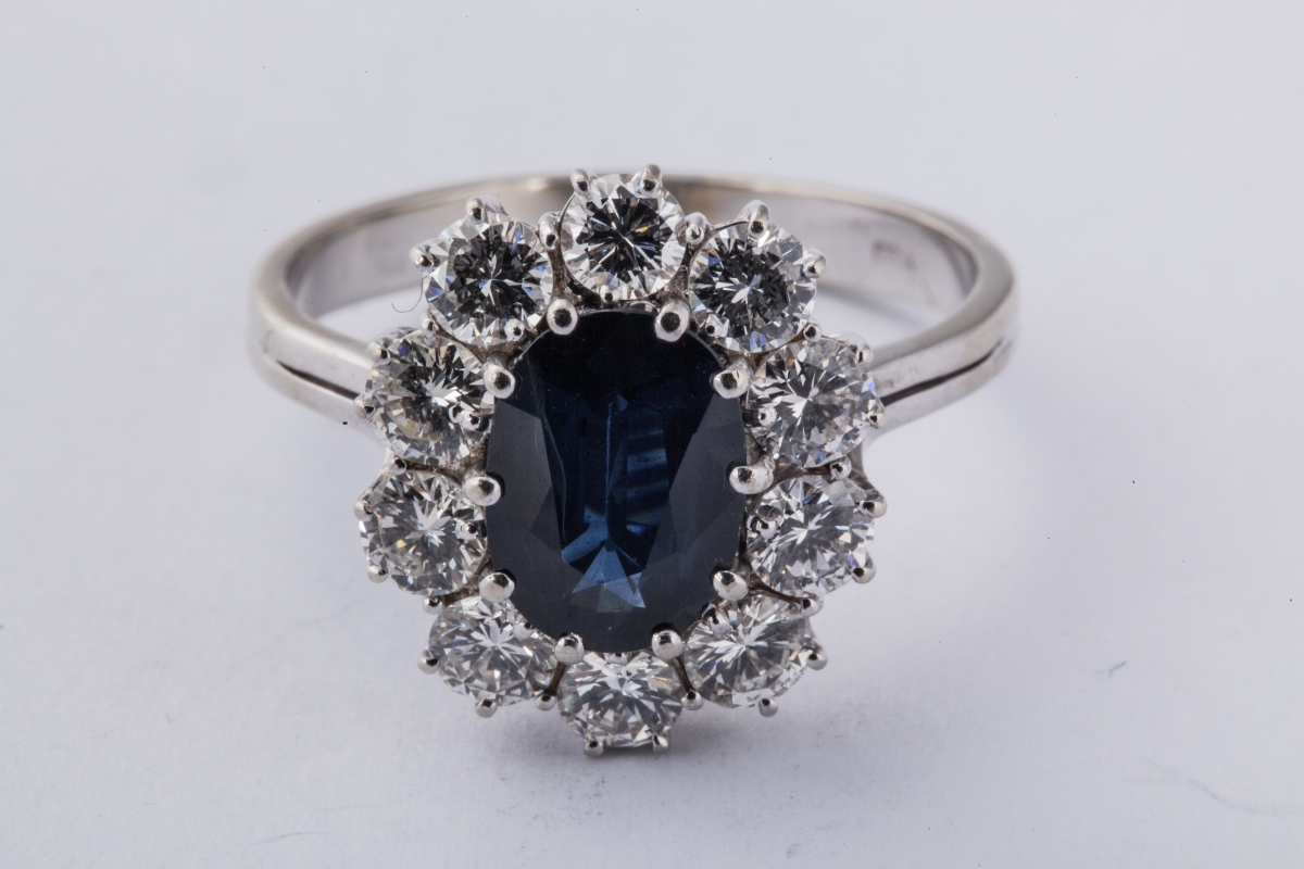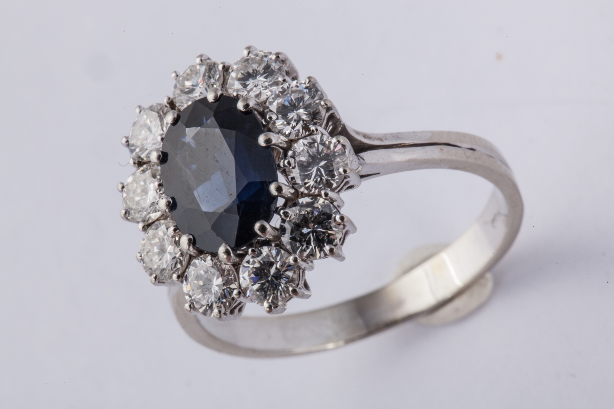 BAGUE en or gris, sertie d'un saphir ovale dans un entourage de dix brillants.
