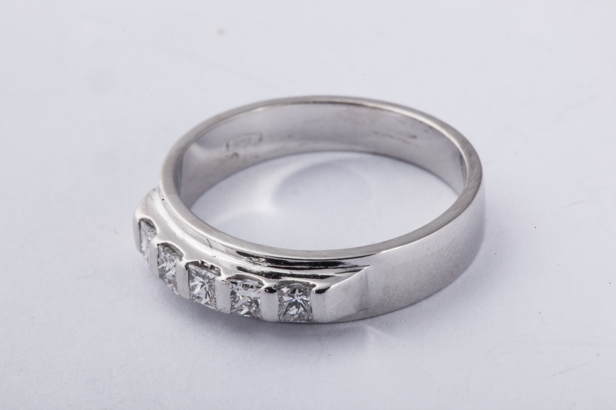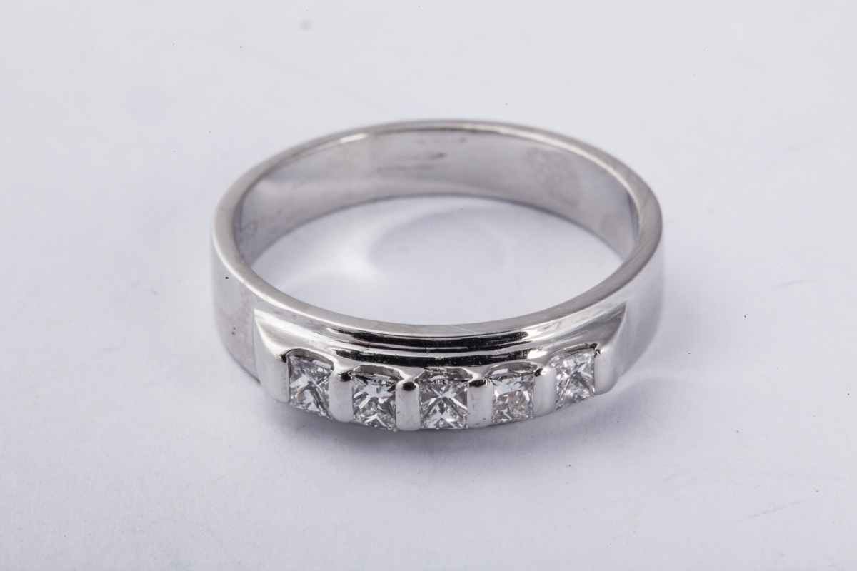 BAGUE rivière en or gris, sertie de cinq diamants princesse.