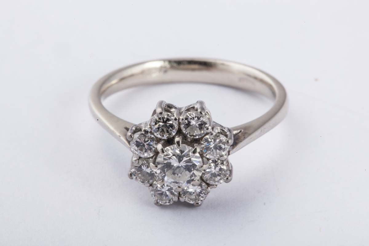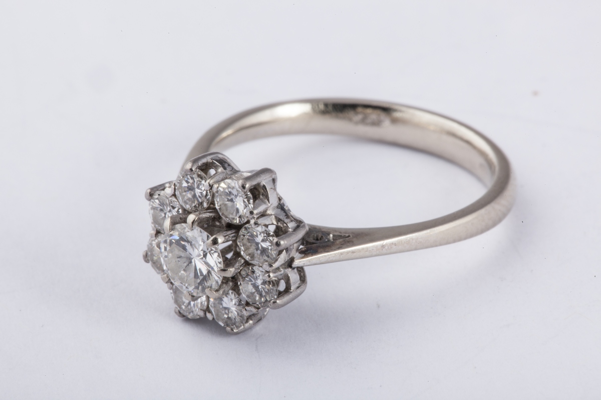 BAGUE en or gris sertie d'un diamant rond de taille brillant dans un entourage de petits brillants.