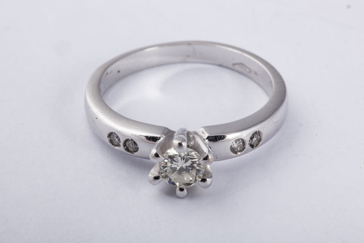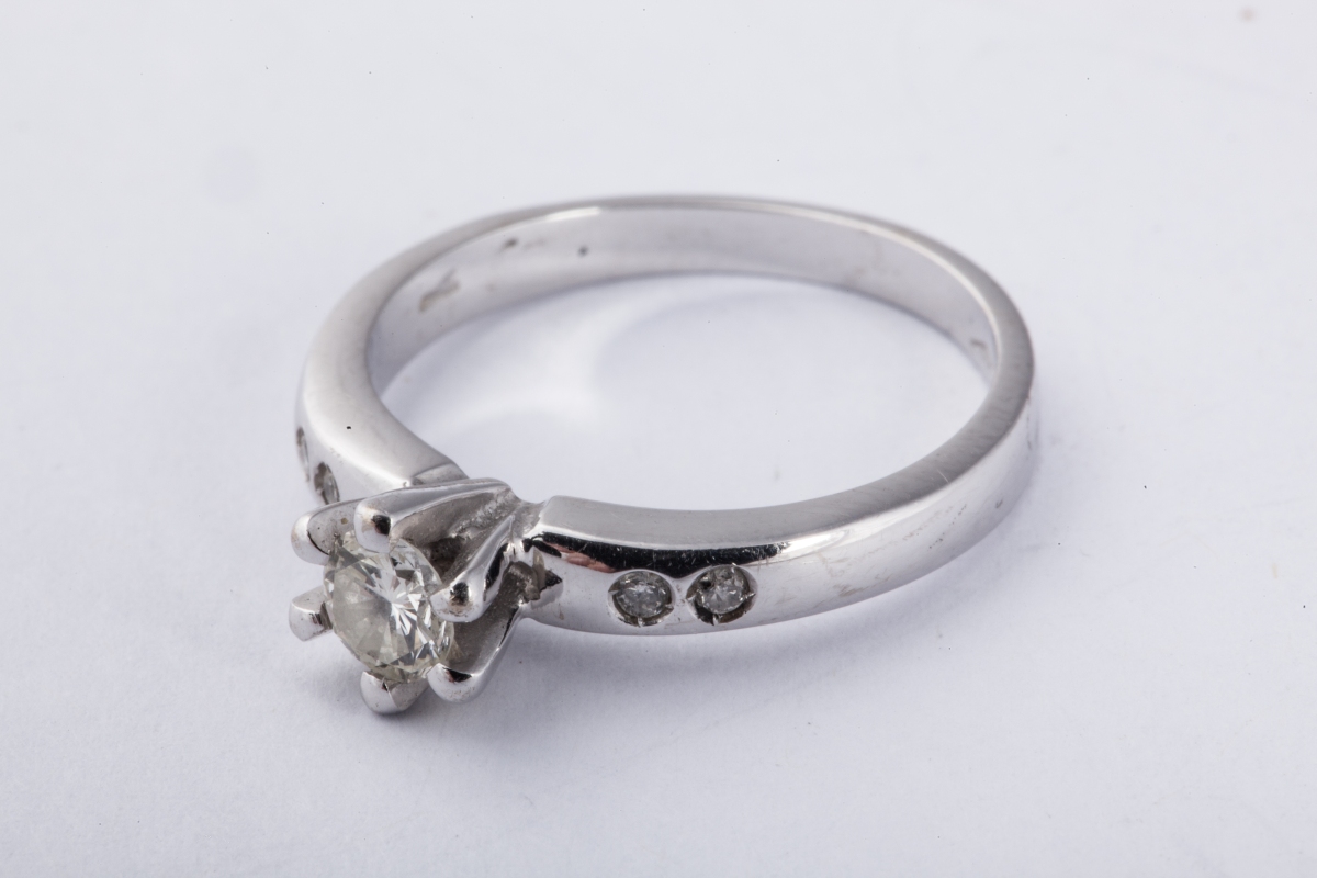 BAGUE en or gris, sertie d'un diamant rond de taille brillant entre quatre petits brillants.