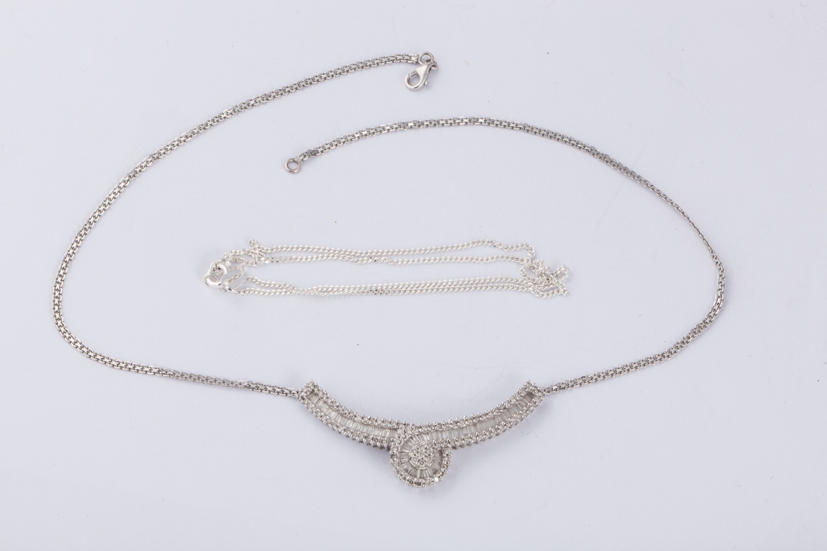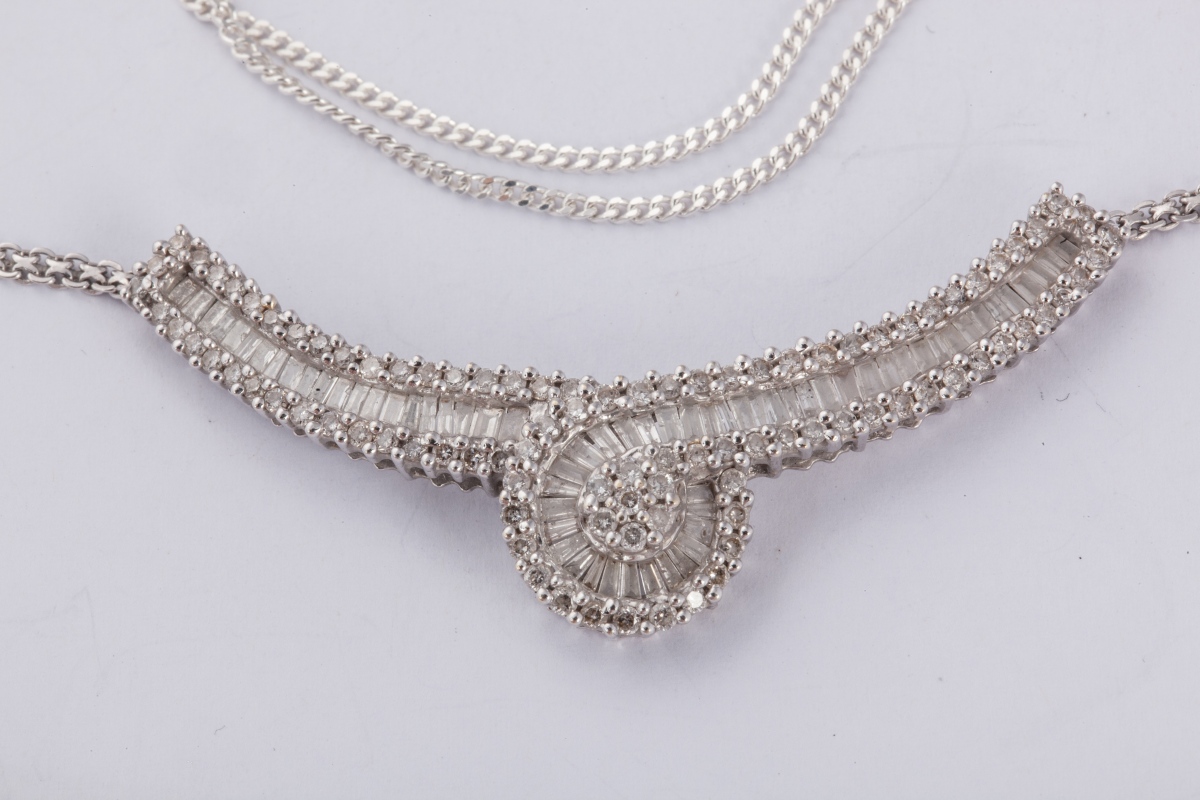CHAÎNE en or gris retenant un pendentif mouvementé en or gris, serti de diamants de taille brillant et taille baguette.