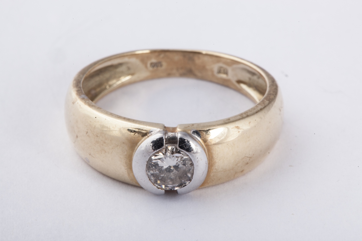LARGE ANNEAU en or jaune 585 millièmes (14K), serti d'un diamant rond de taille brillant.