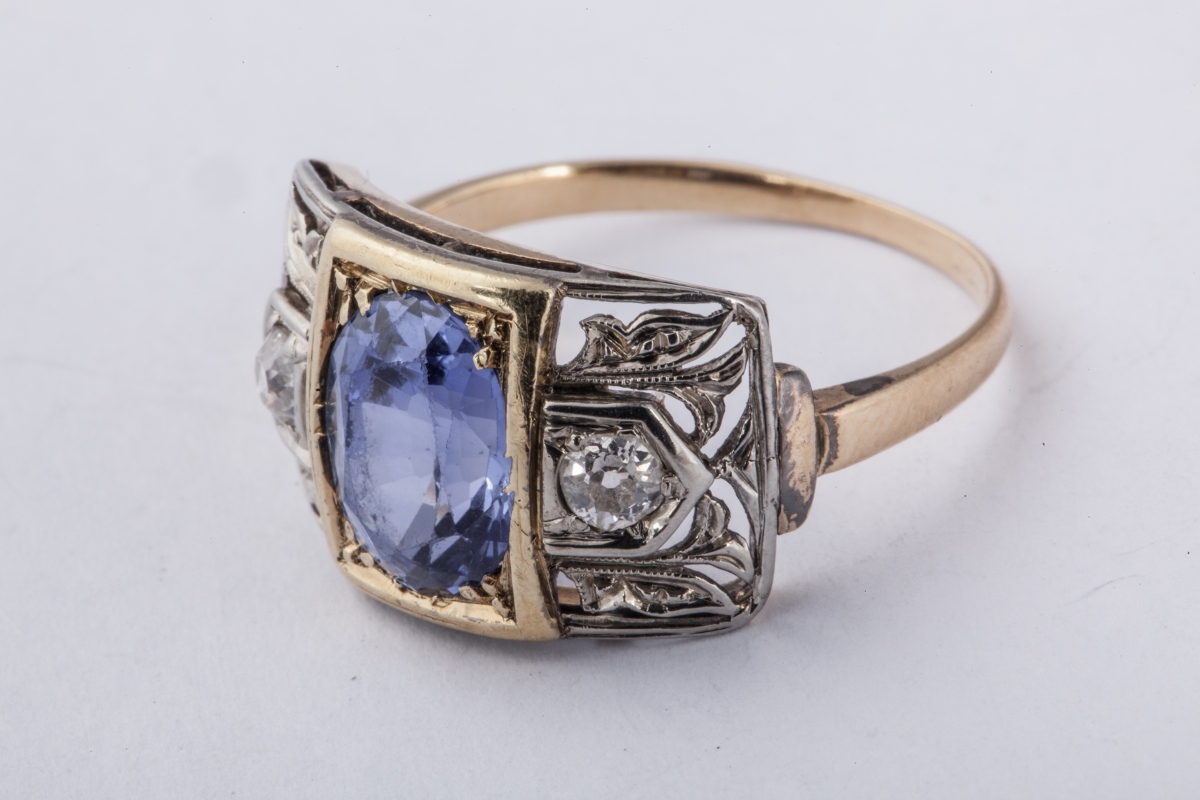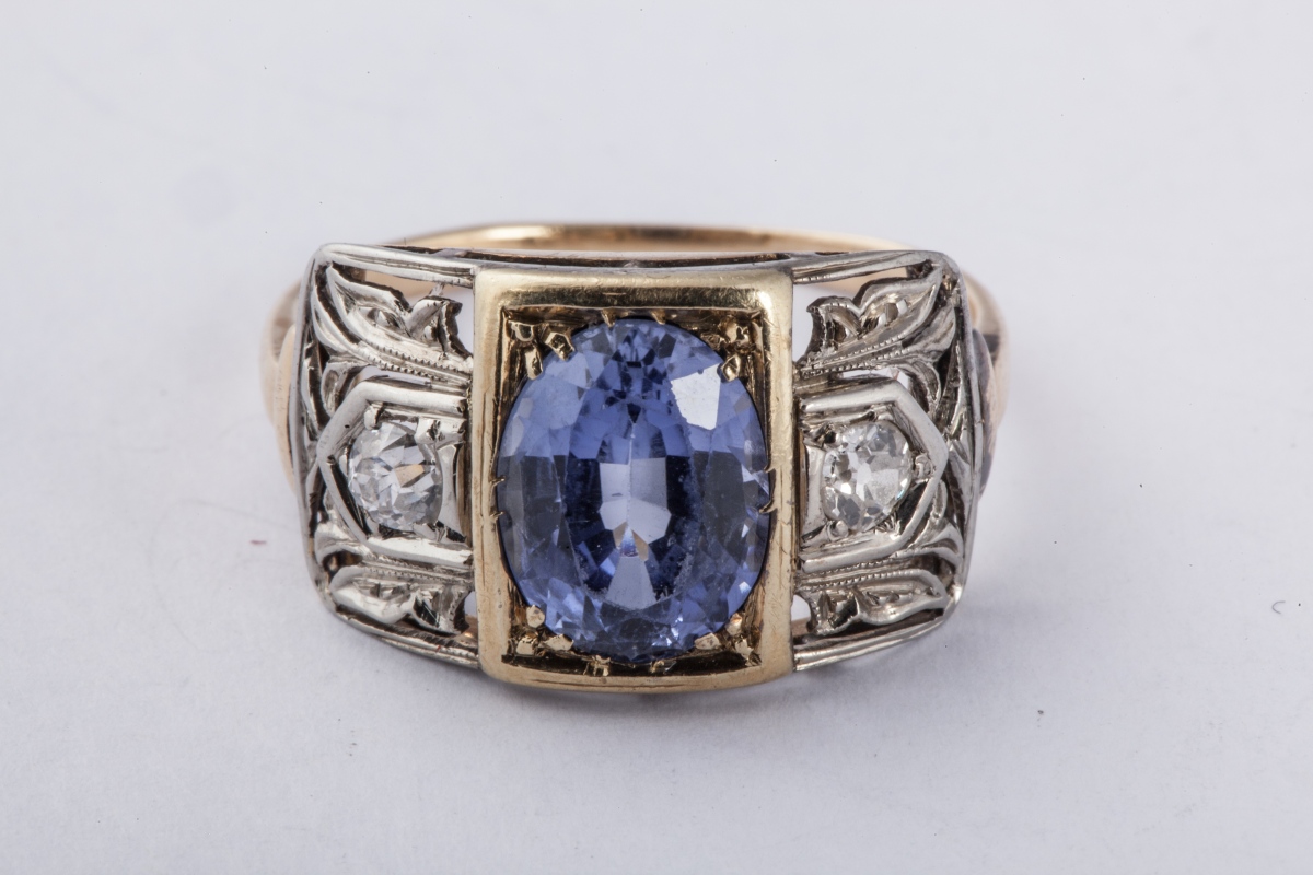 BAGUE en or de deux tons, sertie d'un saphir synthétique et de deux diamants de taille ancienne.