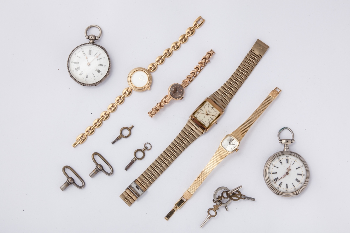 Lot comprenant DEUX MONTRES de poche en argent, deux montres bracelets en métal doré et cinq clés de montre en métal.