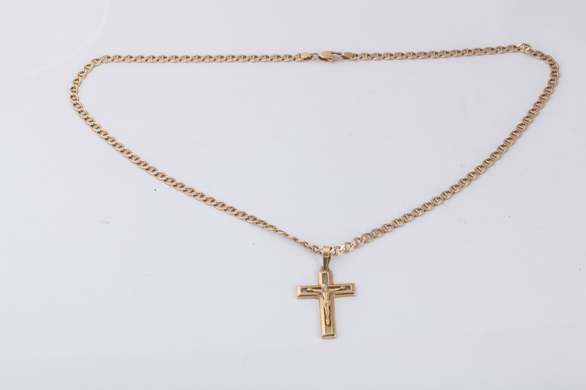 COLLIER ARTICULE en or jaune, supportant en pendentif une croix en or gravé.
