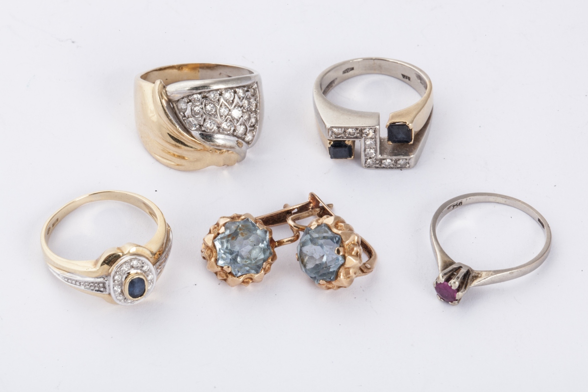 LOT EN OR ou monté en or, comprenant quatre bagues et une paire de boucles d'oreille, serties de pierres fines et synthétiques.