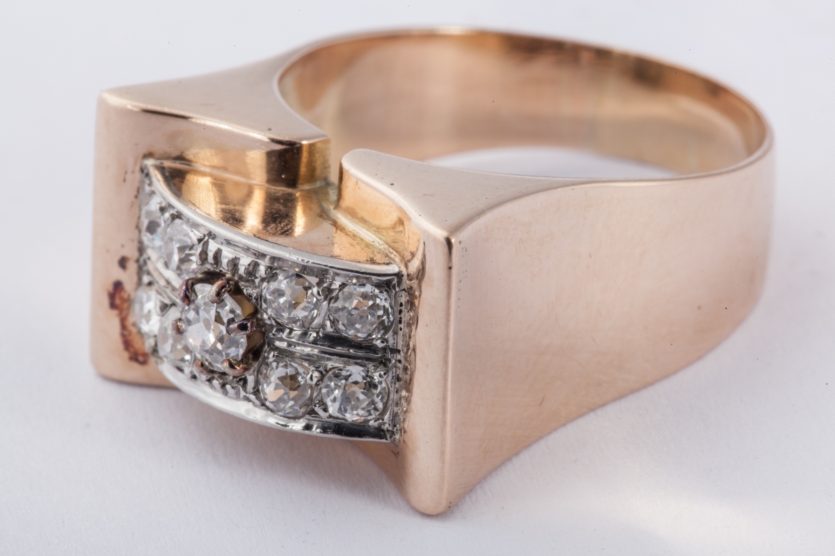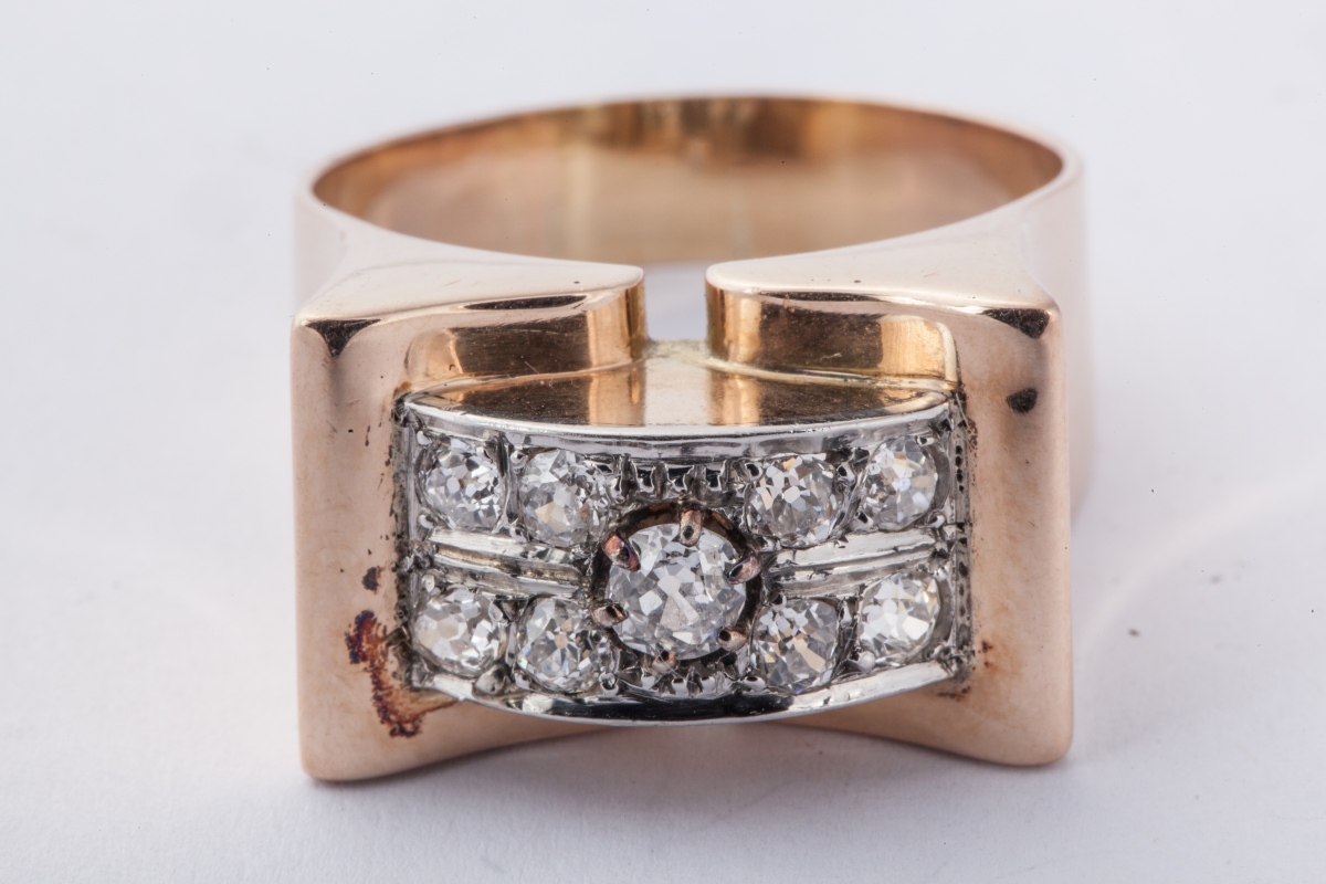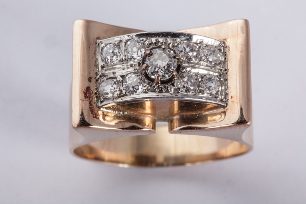 BAGUE genre chevalière, sertie d'un diamant central de taille ancienne entre huit diamants plus petits.