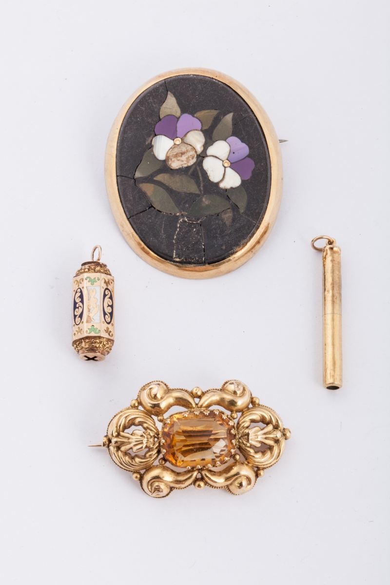 BROCHE or et marqueterie de pierres dures, BROCHE or et pierre semi précieuse, ELEMENT DE PARURE or émaillé et STYLO de bal or. Poids brut 23,6 g