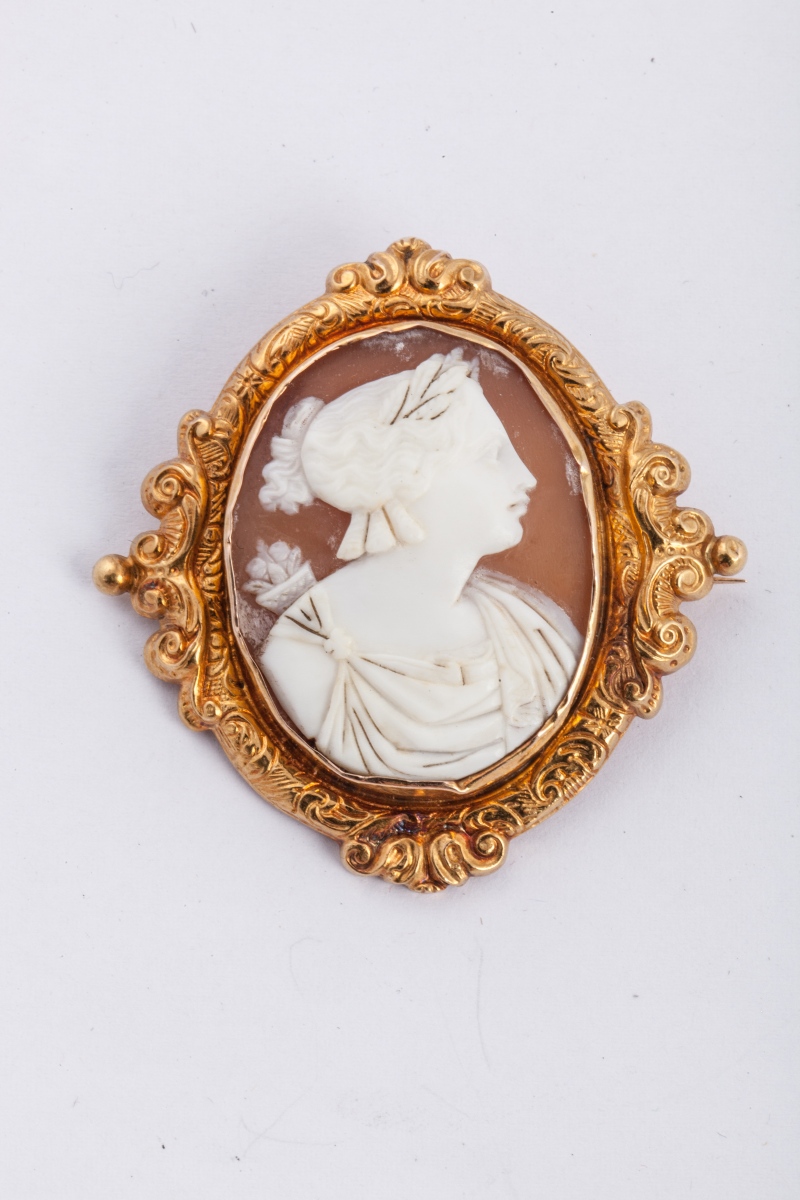 BROCHE en or ouvragé or d'un camée coquille, profil droit de femme drapée à l'Antique. Haut. 4,5 cm. Poids brut 6,6 g.