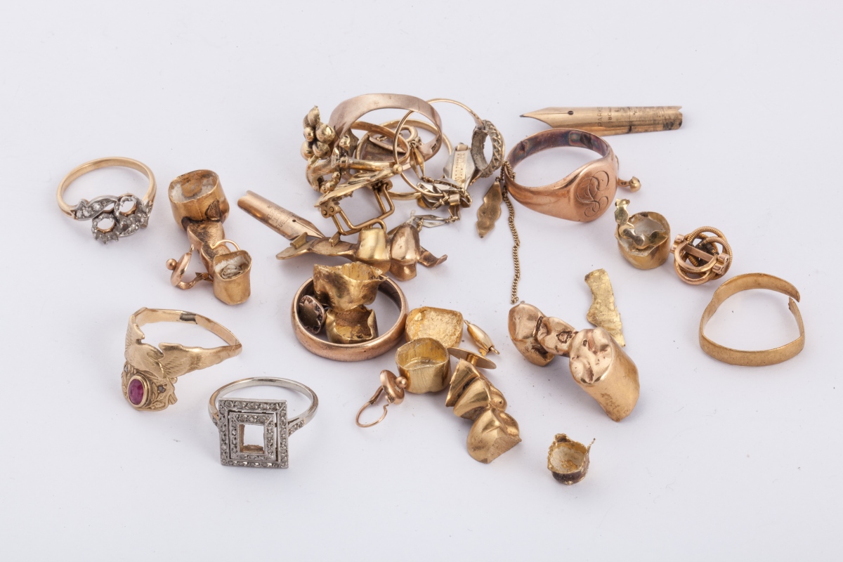 OR: bagues, broche, dents, varia. Poids brut 89,3 g.