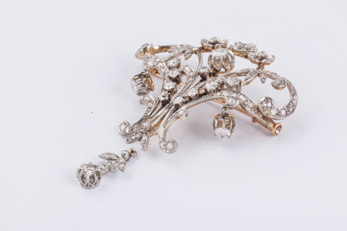 BROCHE volute à décor de fleurs, pouvant former pendentif, en or ajouré, entièrement sertie de diamants ronds de taille ancienne et taillés en rose, dont trois en pampille.