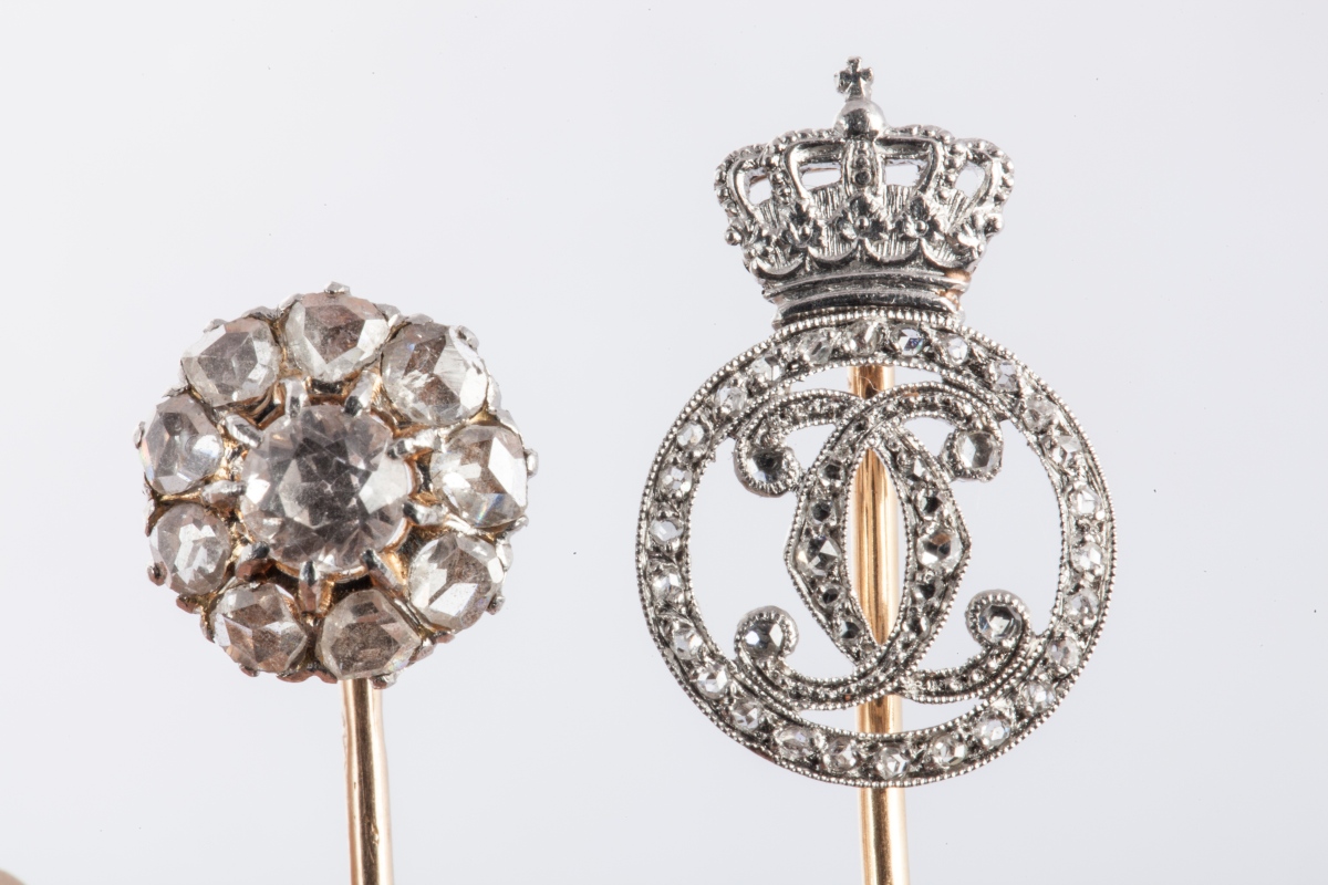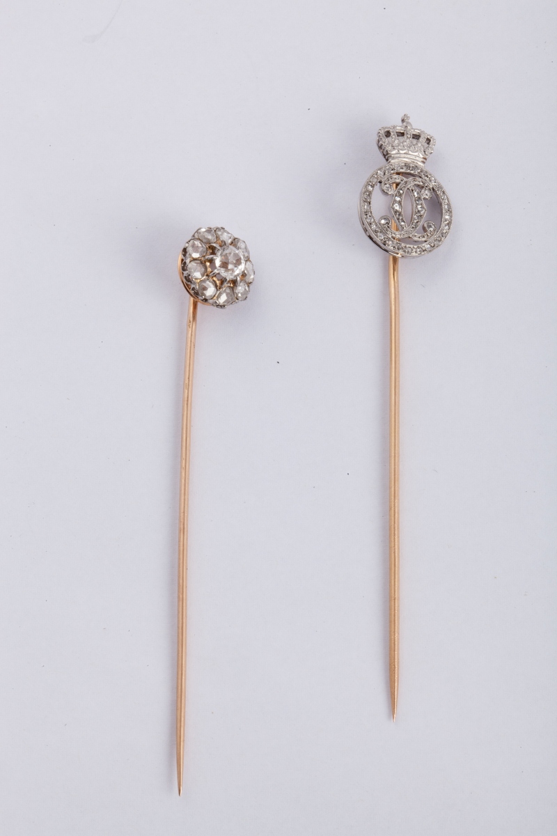 2 ÉPINGLES de cravate, en or. L'une constituée de deux initiales "C.C." affrontées et courronnées, pavée de petites pierres blanches. L'autre centrée d'une pierre blanche dans un entourage de 9 pierres blanches serties sur griffes.