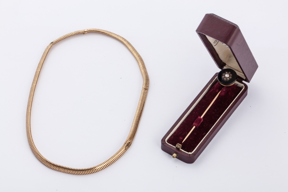 Joint: ÉPINGLE DE CRAVATE en or jaune sertie d'une perle dans un entourage de brillants sur un fond émaillé noir. Poids brut 5,2 g.