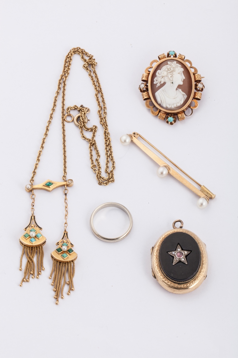 - CAMÉE figurant une profil de femme, monture en or jaune sertie de deux perles et de deux pierres dures bleues. Haut. 3,5 cm. Poids brut 7,2 g.