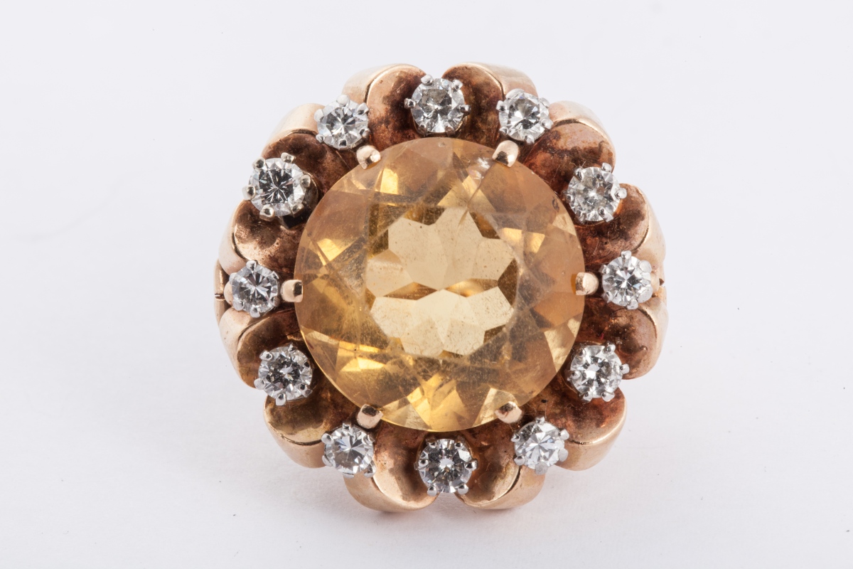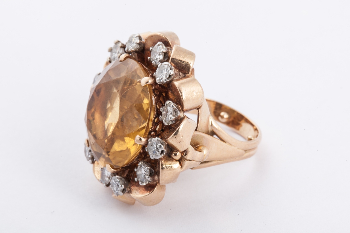 BAGUE en jaune sertie d'une topaze (?) de taille briallant dans un entourage de douze brillants. Poids brut 15 g.