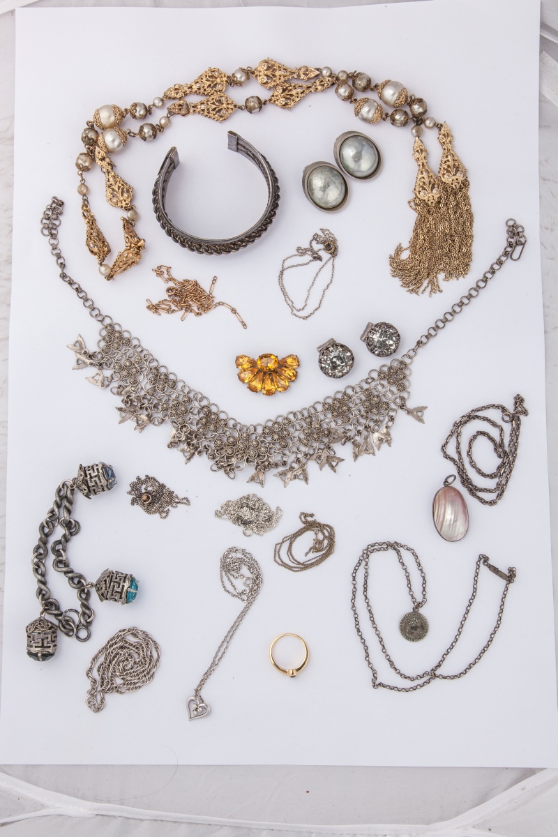 Lot de BIJOUX FANTAISIE comprenant: un collier, trois bracelets, une broche, une bague deux paries de boucles d'oreilles, une bourse et un lot de chaines.