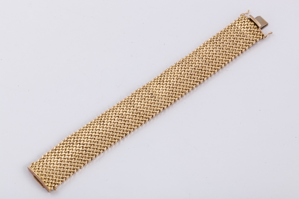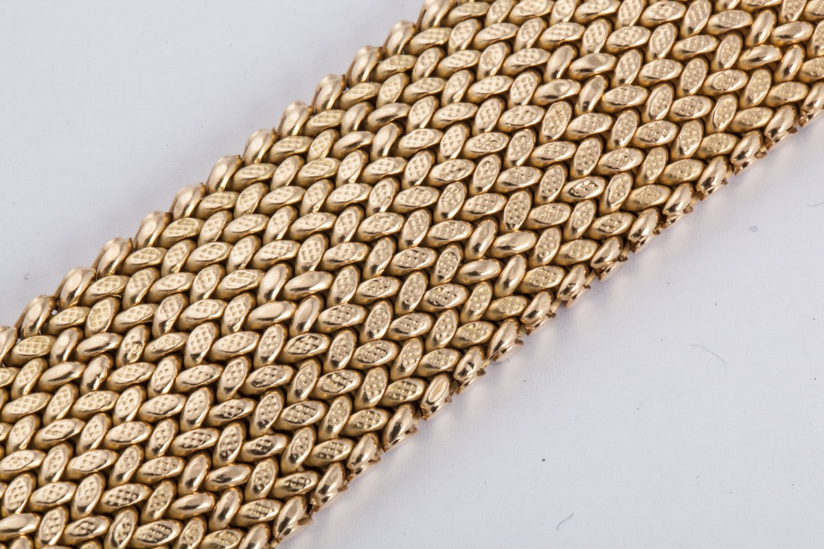 Large BRACELET en or jaune maille souples. le fermoir en or blanc. Long. 20 cm. poids 48,5 g.