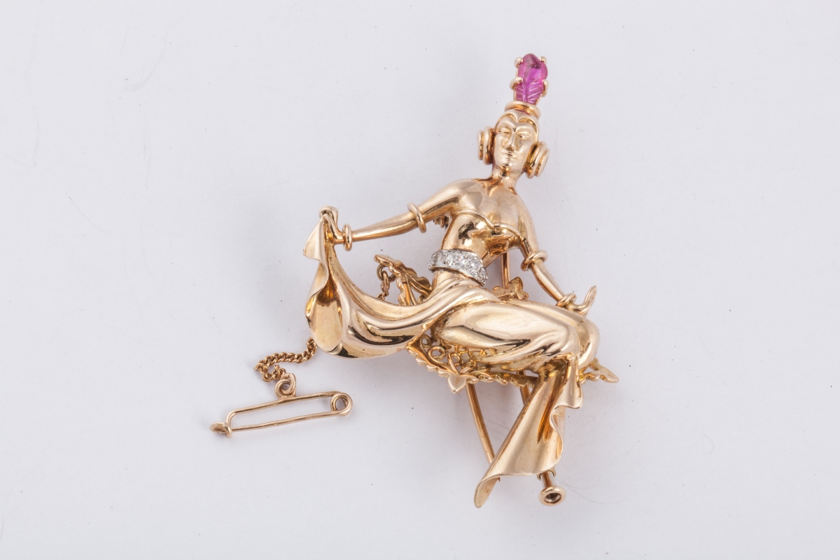 BROCHE à l'INDIENNE en or jaune, ceinture de brillants et pierre semi-précieuse en guise de coiffure figurant une jeune femme en tenue des mille-et-une nuits sur son tapis volant, avec son épingle de sureté.