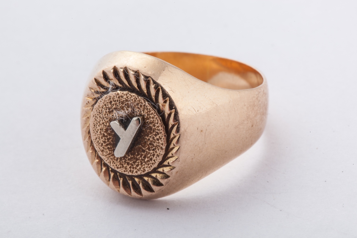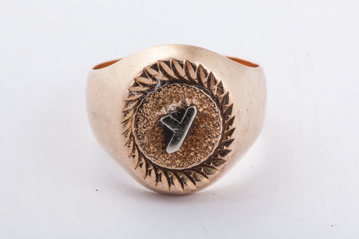 CHEVALIÈRE en or jaune de forme circulaire orné d'un "y" en bas relief. Poids brut 6,4 g.